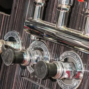 Marathon's two-tank system provides three potential advantages over the industry norm of a single waste tank. First: because all the sink drains are connected to the gray tank - which has no sewage - if a P-trap dries out, the only smell that can escape is that of soapy gray water, unlike coaches with a single tank, which also houses black water, and thereby produces a sewer smell. Second: if one was unaware of full gray tank levels causing an overflow, harmless gray water would emerge in the shower pan (the lowest drain in the water system), rather than sewage for those on a single holding tank system. Third: although using an approved dump site for all dumping is ideal, in case of emergency it's good to know there's more flexibility with gray water dumping, as approved locations are not mandatory; since most customers generate more gray than black water, this can add a level of convenience should the gray tank be full. PLEASE NOTE: Dumping the black tank is only legal at approved sewer dump sites.