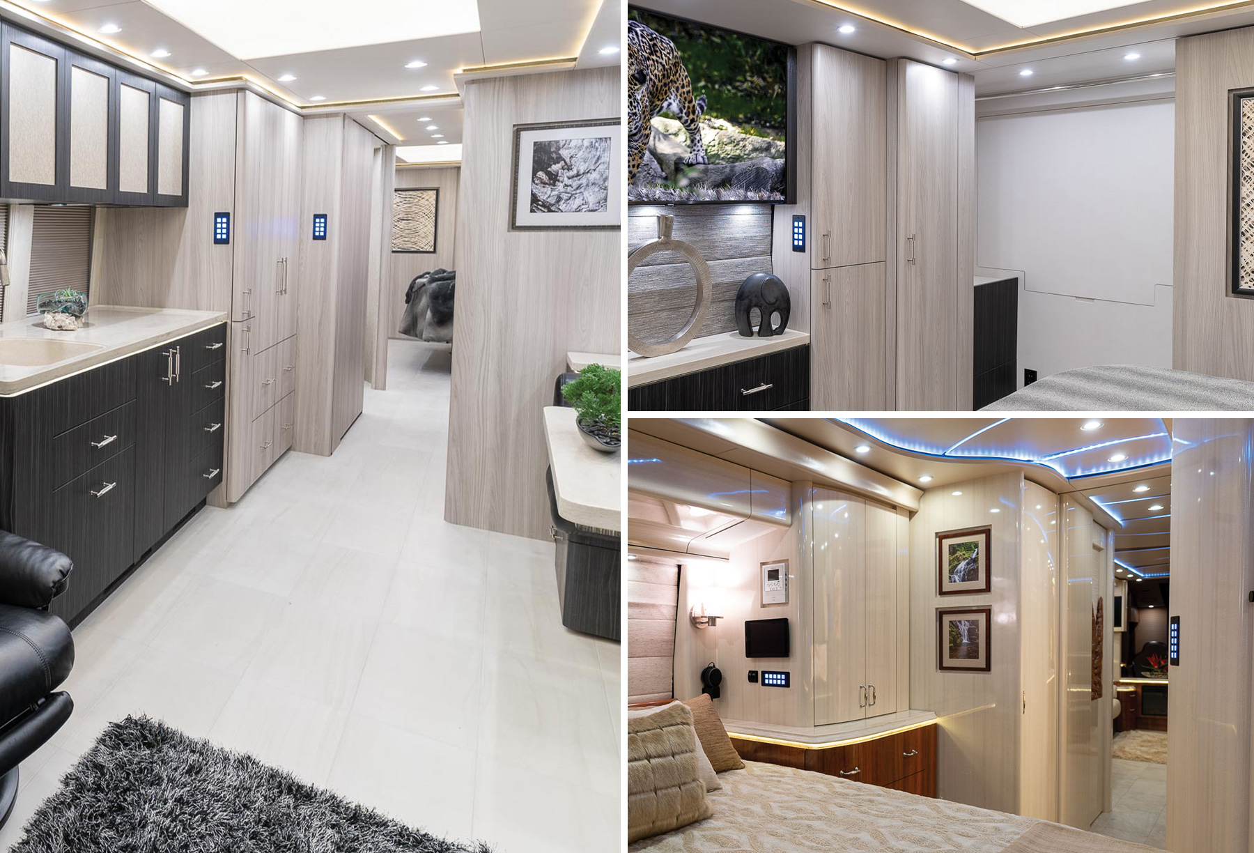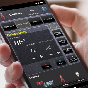 Crestron does more than connect functions such as audio/video or lighting - it integrates all of Marathon's functions into one seamless command center, which is accessible from a smart device. As long as there is a signal, clients can use their secure cell phone or tablet app to monitor and control their coaches via the Crestron system. Adjust the temperature for pets left behind when out to lunch a couple miles away, unlock doors for visiting family from across the country or turn on the lights to take a peek inside via camera while traveling abroad.