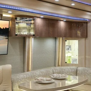 Marathon dinettes are created to be comfortable and functional - the perfect place to enjoy a good meal. In their quest to maximize space in every inch of every coach, Marathon engineers integrate storage in expected and unexpected places alike. One example is the angled L-shaped dinette, which features drawers underneath and hidden storage behind the seat backs.