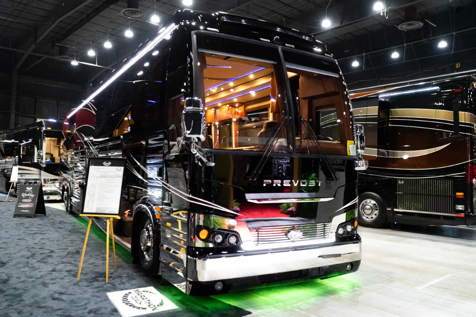 We were especially excited to complete the first bus conversion on the new Prevost X3 chassis and display it at the Prevost Expo. In addition to Prevost's innovation - including 8-10% fuel efficiency boost, increased structure rigidity and safety, and more - Engineering Manager Jay Graham and his team pushed further creating even more usable space, higher ceiling and broader views. The updated X3 chassis as it comes from Prevost is 2.5 inches higher on the interior than the previous model. Because Prevost eliminated the rounded corners along the roofline and made them "arc to arc," much like an H3, we were able to raise our finished ceiling an additional half inch for a total ceiling height increase of 3 inches over the previous X3 model - we begin with an incredible 91.5 inches unfinished floor to roof beams. This increased ceiling height - combined with wider windows - results in additional exposed height and interior space at eye level. If you get the chance, check out one of the upcoming Marathon X3s, including #1324, #1325 and #1330.