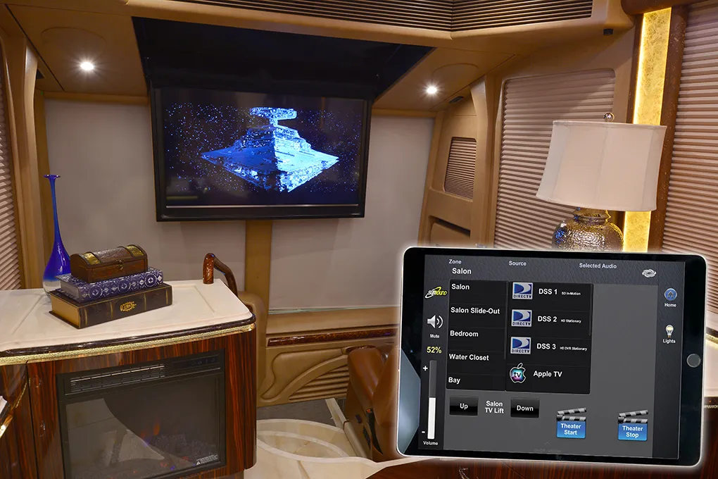 The Crestron system allows nearly any electronic device to be incorporated and controlled from the one touch pad. When your system and devices go beyond connections to true communication, you're free to create your ideal environment. This unrestrictive programming ability also allows us to make multiple events happen in sequence from the push of one button. With a single touch from your mobile app, touch screen or key pad, you can prepare your coach for movie night, high-end entertaining or bedtime. No other system provides as much ease of use and convenience. In short, we're not limited by equipment, only our imagination.