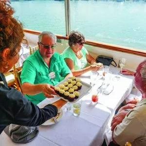 After boarding and receiving a welcome glass of champagne, attendees enjoyed exclusive access to the sensational yacht. As the impressive vessel left the harbor, many could be found in the fireplace room -- the heart of the Wild Goose -- where Wayne spent days playing bridge while savoring brandy on the rocks. Others soaked up the sun, choosing instead to sit outside on the deck, while still others followed their curiosity, touring the many spaces on the ship, including Wayne's bedroom, his children's room and finally the upstairs dining area, where a decadent buffet-style lunch was served, followed by three courses of dessert.