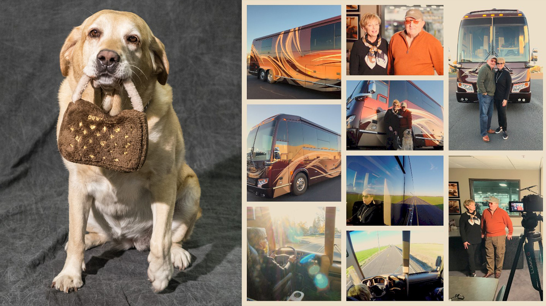 Marathon coach owners Milo and Jesse never take a road trip without their faithful companion Charly. And Charly? Well, this six-year-old sweetheart never leaves home without her Chewy Vuitton (or her dog parents).
