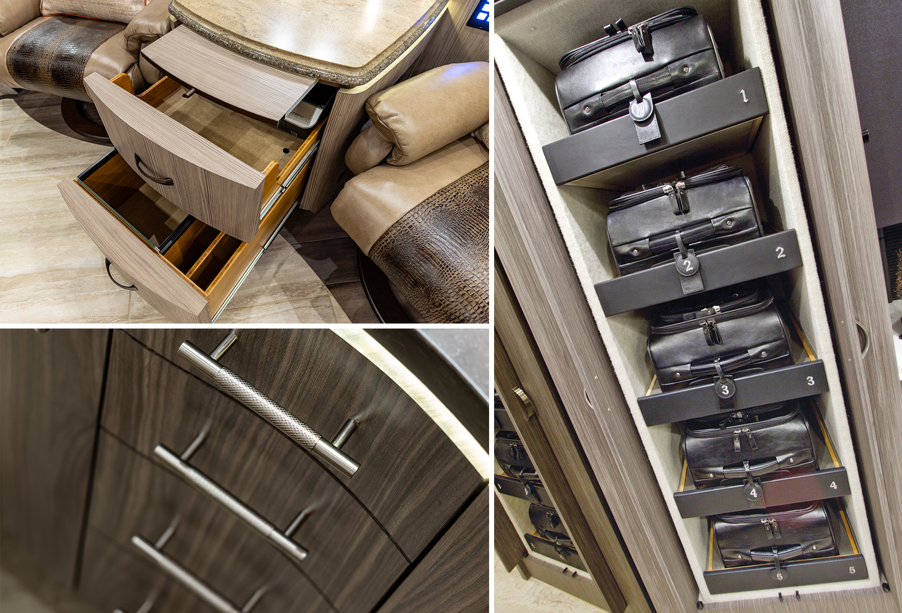 "Wood-grain matching on our laminate is time consuming and expensive; but it is a detail that matters to the discriminating," said Brenda. "Unlike our competitors, we hide all our hinges, for a clean, invisible look that doesn't distract. I think of our cabinetry as a microcosm of our bus, because what is inside our cabinets matters as much to us as what one initially sees on the outside. The 'simple, easy, invisible' qualities of design that Gassee refers to is seen in the dovetailed solid bamboo drawer boxes that are custom stained, pantries that pull all the way out on quality glides, four to six heavy hinges on every wardrobe door to keep them even and square no matter how many miles are driven. Besides all of that, we wrap the bases of drawers and all of the wardrobe shelving/walls in a leather composite material that makes cleanup easy and protects the contents, which may move when in motion. We don't cut corners - even in 'hidden' areas - and it shows in the longevity of our buses. You can purchase a 10-year-old Marathon and the foundation is still solid; it may only need a few interior changes to bring the look up to date."