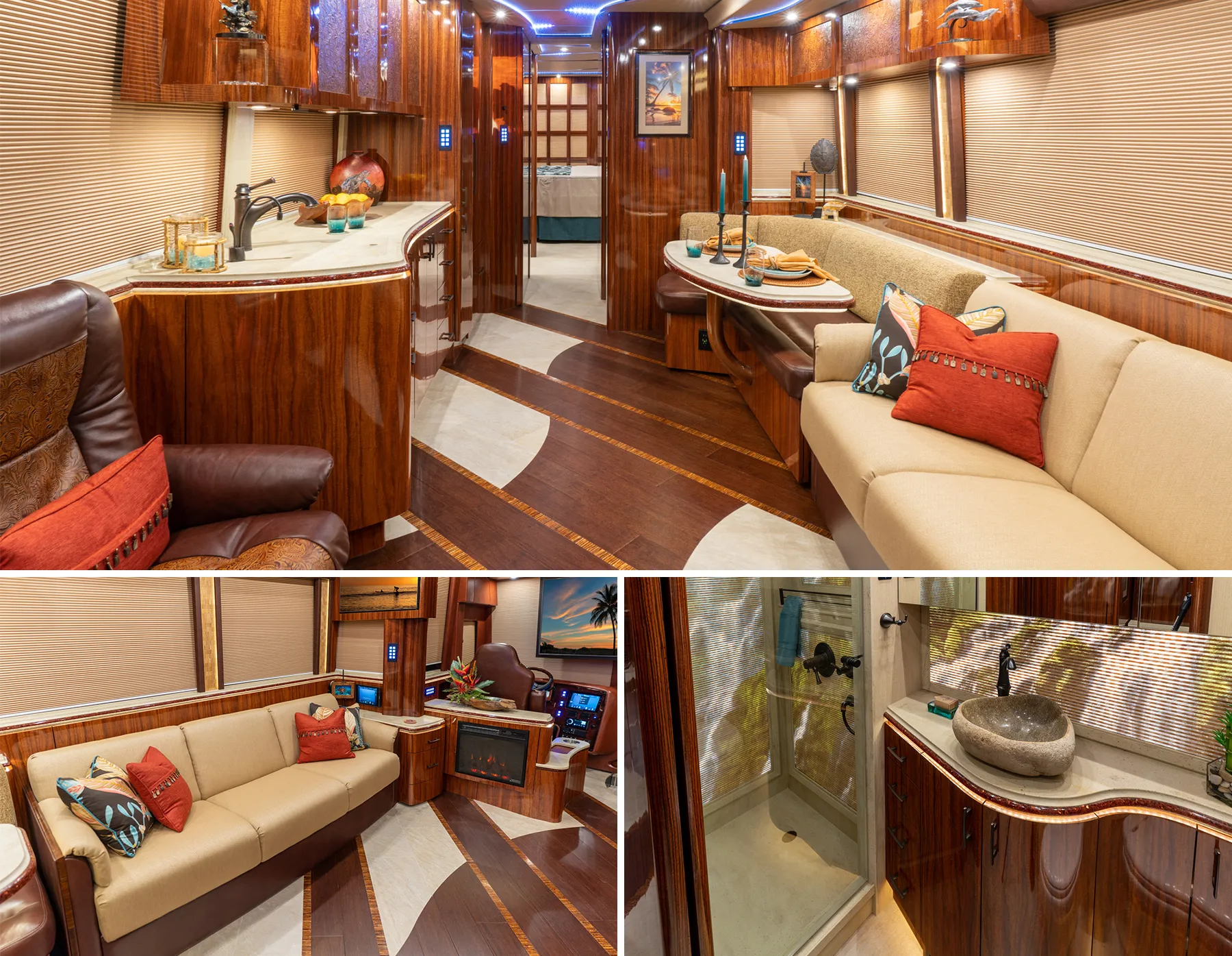 Built on the bath-and-a-half floorplan with rear walk-in wardrobe, Marathon Show Coach #1317 features a 360° camera system, slide room roof camera system, fireplace in the salon end table, multiple 55-inch televisions, rainfall shower, standard king bed and Marathon's patented TechLink and Freedom Plus systems.
