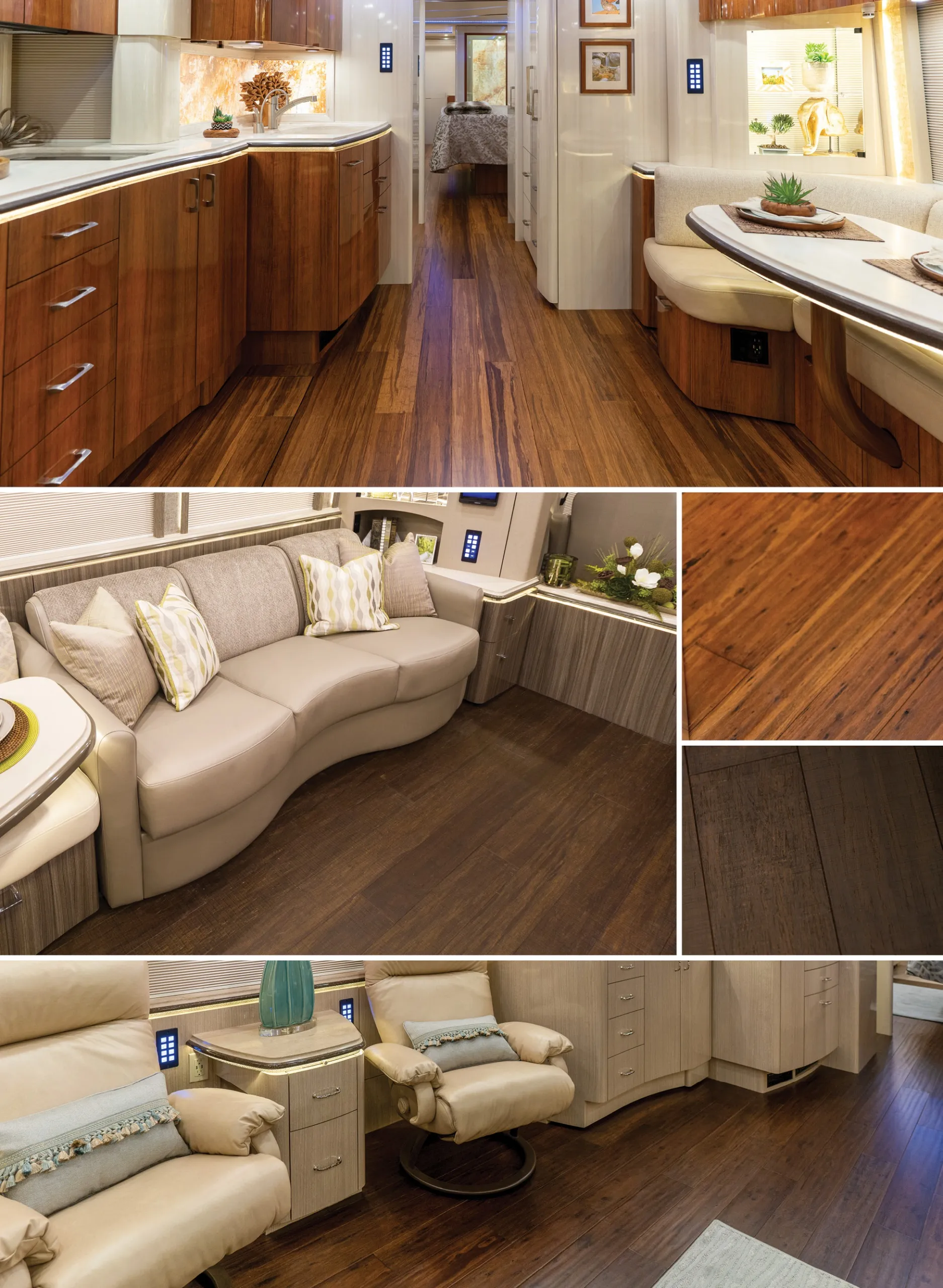 - Considering a flooring upgrade? Marathon Coach Texas works with a wide variety of the finest hardwood flooring materials to match the best wood with the perfect coach interior. When considering which flooring material to use, color and texture (e.g., hand-scraped) are usually compared to the coach's laminate to create a tone-on-tone or contrasting look, depending on what the client desires. Other things to consider are the hardness of the wood and its resistance to moisture. Harder woods tend to be more scratch-resistant and some wood finishes have several coatings, which are designed to last for years. Durable and easy to clean, wood and sustainable stranded bamboo flooring come in many colors and finishes to match your interior.