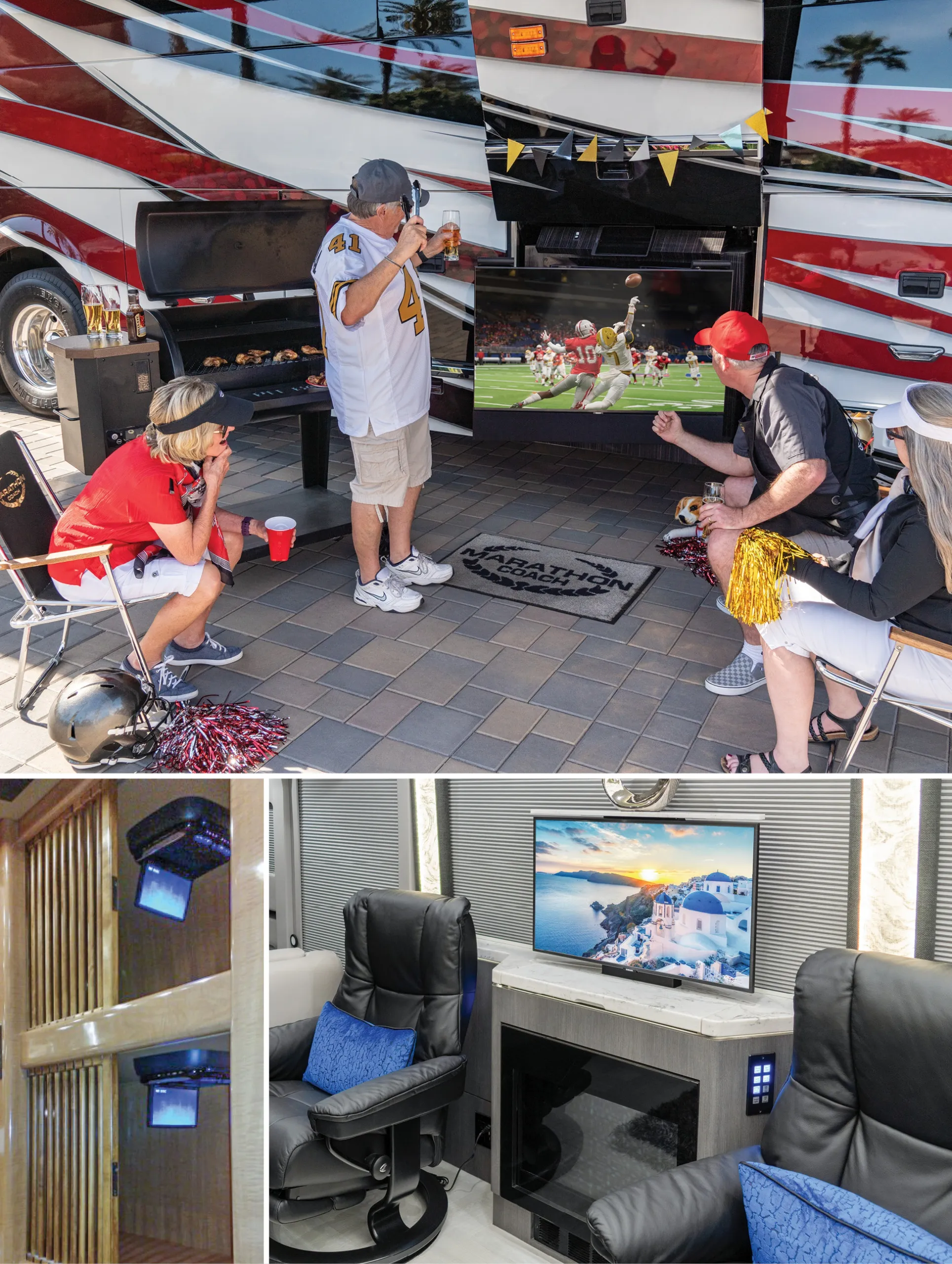 - Whether it's an NFL team owner enjoying watching his team roll to victory on the big screen or children watching their favorite animated movie, Marathon continually evaluates the top brands and components for all audio/video systems to give our customers the best and most reliable equipment available. Our ever-evolving search for the best includes top-rated Ultra HDTVs - with home theater surround sound - all controlled from your iPhone, iPad or Android device. Marathon Coach Texas can custom-build an outdoor entertainment center or mount a television on your bathroom wall so you never have to miss a second of the game. If you can imagine it, chances are, Marathon can make it a reality.
