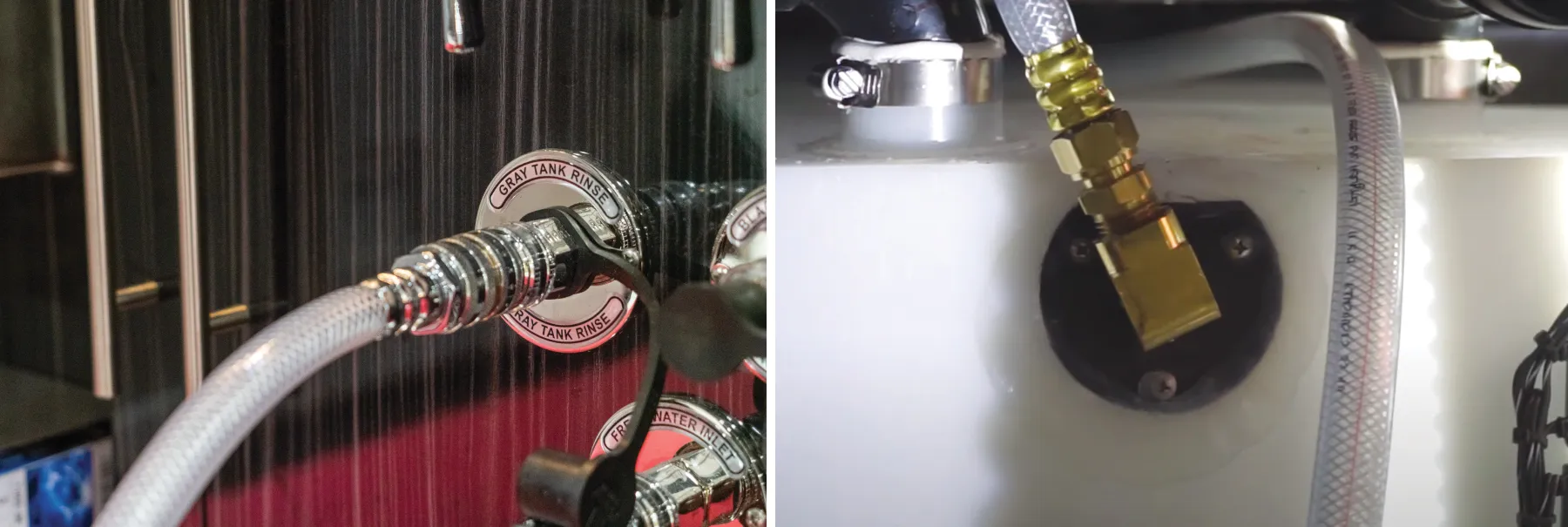 - Connect the water hose to either rinse valve (there's one for the gray tank and one for the black tank).