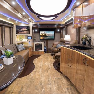 Sparkling mosaic tile adorns the entry step risers, a hint of what awaits inside. With stranded bamboo wood accents and easy-to-care for heated porcelain floor tiles with a rugged, hand-scraped barn wood look, this carpet-free luxury RV was perfectly designed for endless days and effortless cleanups, even when traveling with pets or children.