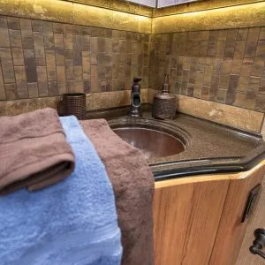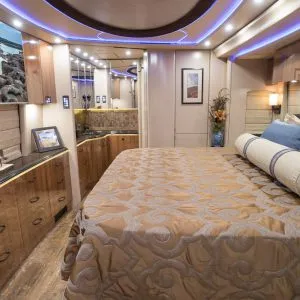 As night falls, the grand master suite is the epitome of luxury with its regal-looking gold and dusk custom-designed comforter. The upgraded, adjustable king bed is ideal for watching favorite programming on the 49-inch Samsung TV; however, for avid travelers, it also allows a comfortable pathway to the rear of the coach even with the slides in.