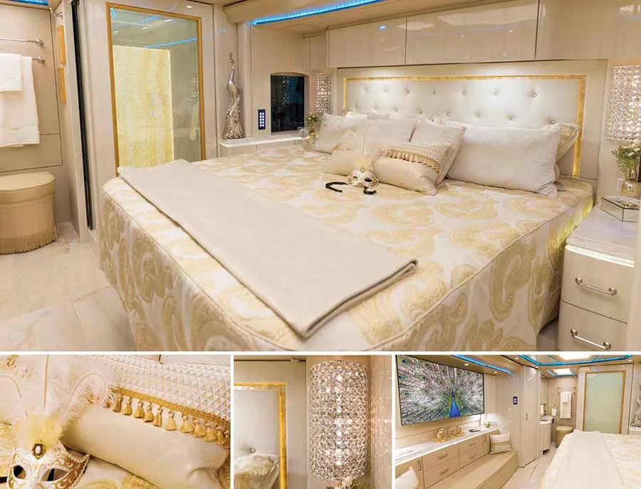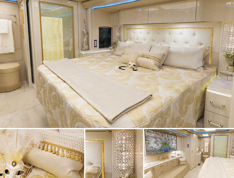 As night falls, the grand master suite is the epitome of luxury with its regal-looking gold and ivory custom-designed comforter. The upgraded, adjustable king bed is ideal for watching favorite programming on the 55-inch Samsung TV; however, for avid travelers, it also allows a comfortable pathway to the rear of the coach, even with the slides in. The backlit headboard, crystal sconces and lustrous pulls complement the polished accessories, flawlessly pulling everything together.