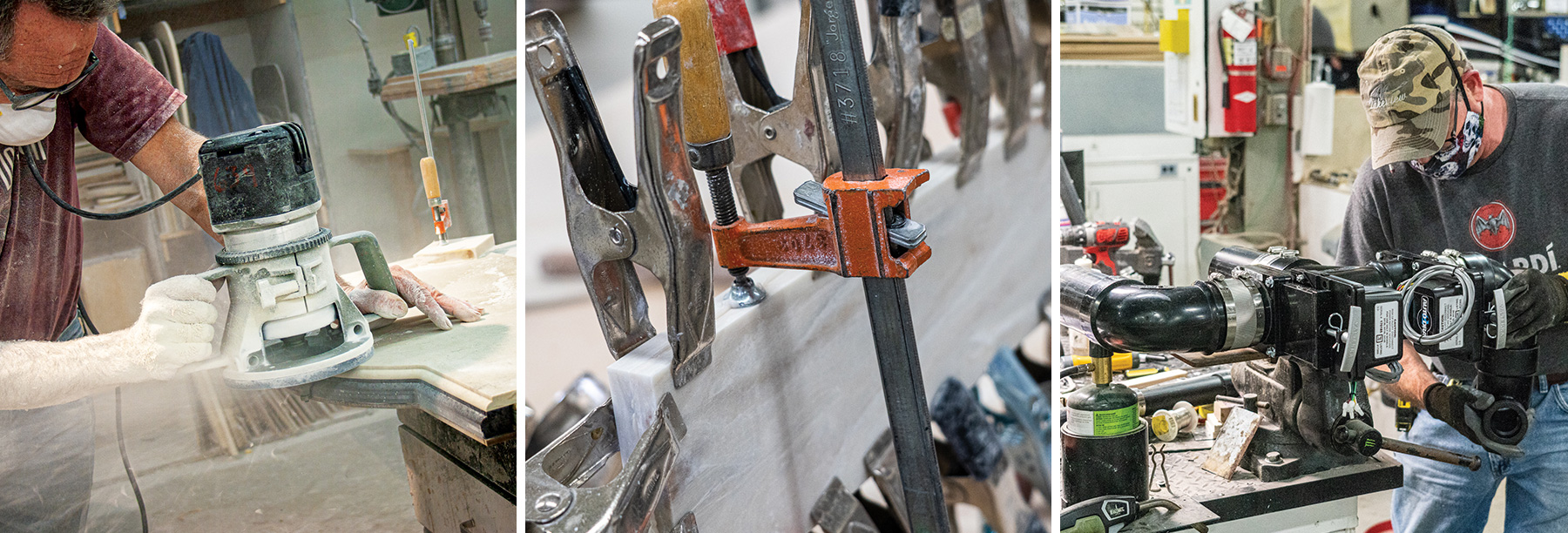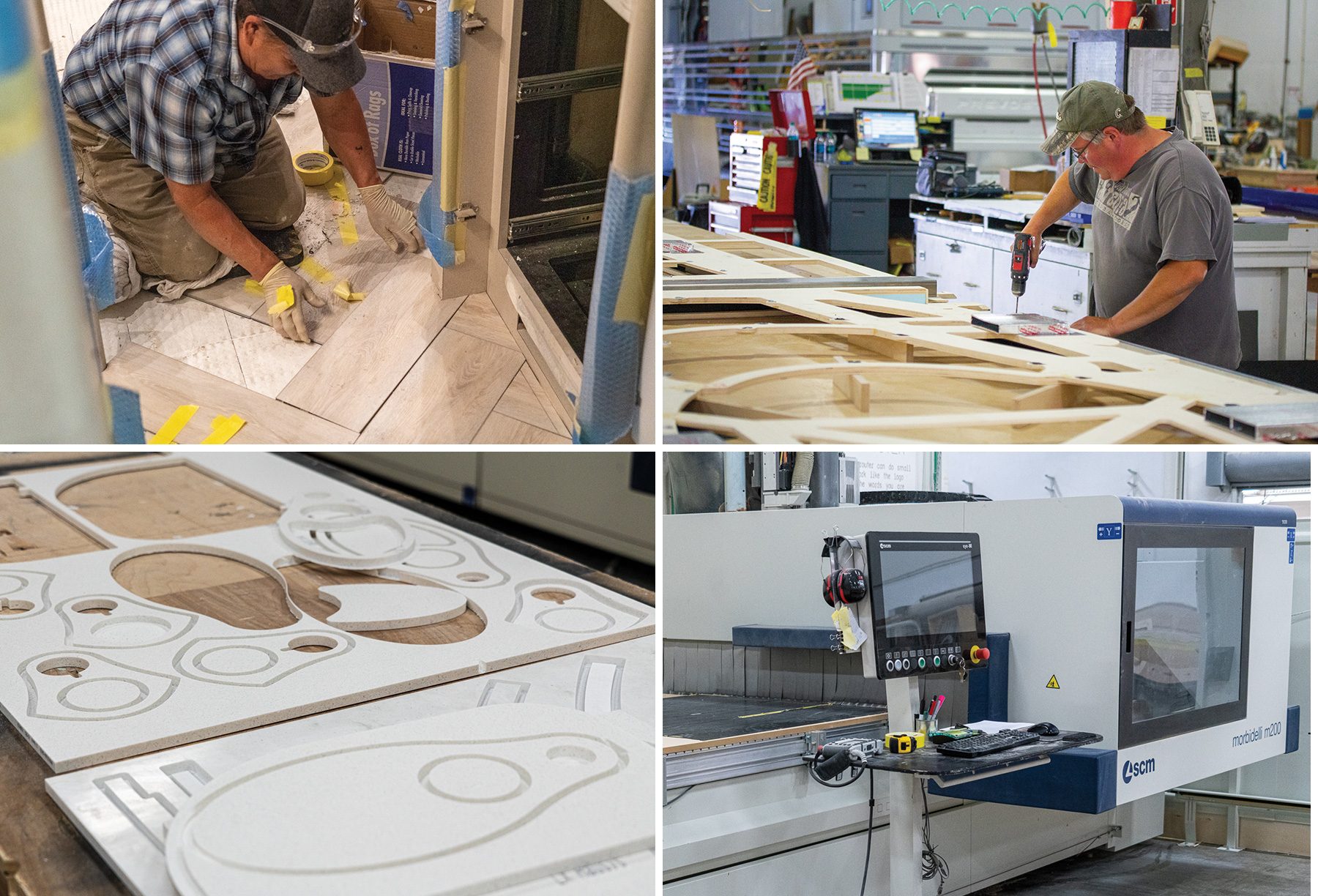 A small unit of uniquely skilled artisans in the solid surfaces area creates some of the most frequently used items in the bus conversion. With the technology to heat and bend materials to intricate shapes, Marathon's solid surfaces department fabricates countertops, sinks, shower features, entryways, fan covers and some smaller items such as snack trays and blind guards. Most of the solid surfaces throughout a Marathon coach are cut and formed from Corian and other brands of synthetic stone, chosen because they are lightweight, adaptable, repairable, easy to clean and available in a wealth of colors and styles. All of Marathon's solid surface work is done in-house, and the quality is evident in the stylish molding and flawless seams in every surface of every coach.