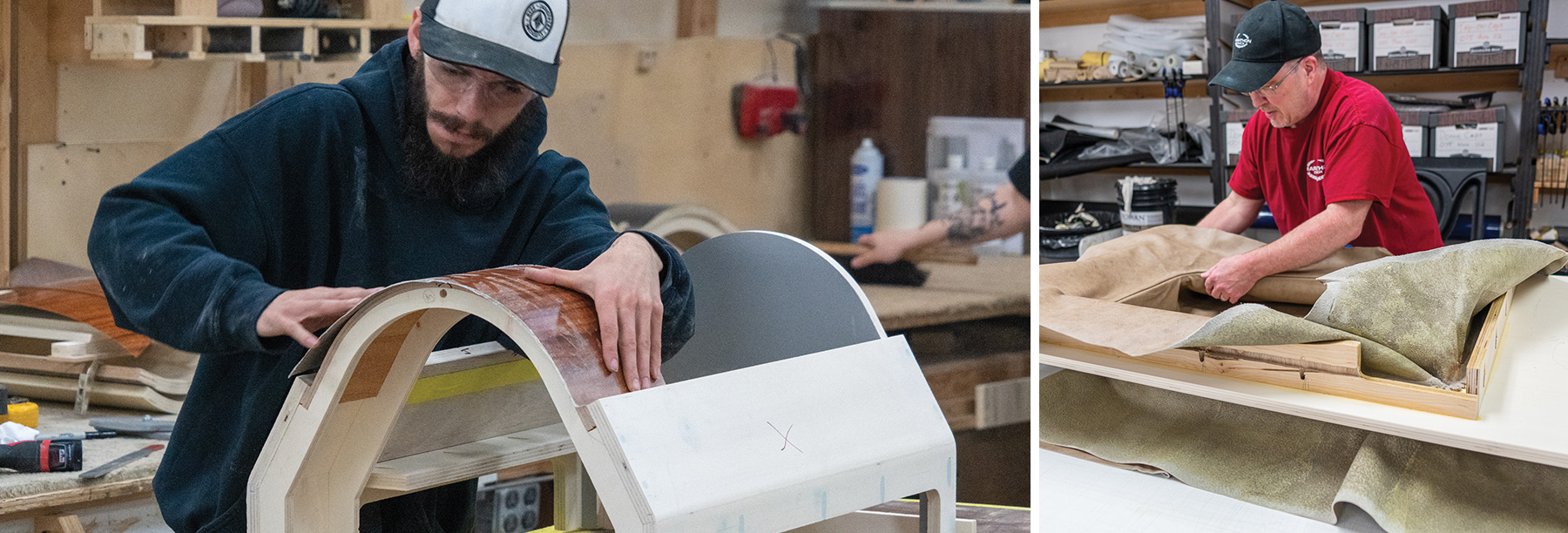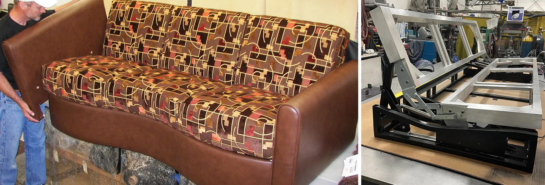 More than 20 years ago, unsatisfied with the quality of supposed "high-end" sofas, Marathon decided to build its own in-house, and since then, we've been constructing our own sofas from the ground up. Step into Marathon's "sofa palace" and immediately experience the sights, smells and feel of the highest quality raw materials, custom-ordered, measured and cut for our sofas, dinette seats, furniture upgrades and more. For our posh salon sleeper sofas, we even make the folding bed frame from scratch. We purchase our top-of-the-line recliners and cockpit seats, and immediately remove the covers and cushions and refurbish them to a higher standard with better materials and added comfort and style. On any given day, you'll see Charles Null or Kevin Perrier measuring and cutting leather, fitting springs and foam around raw wood and creating patterns that will be passed on to the upholstery department to implement Marathon's exceptional fit and finish.