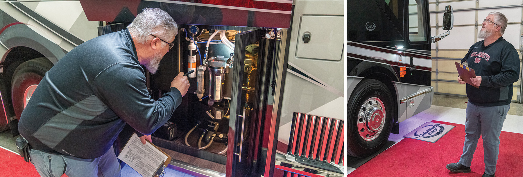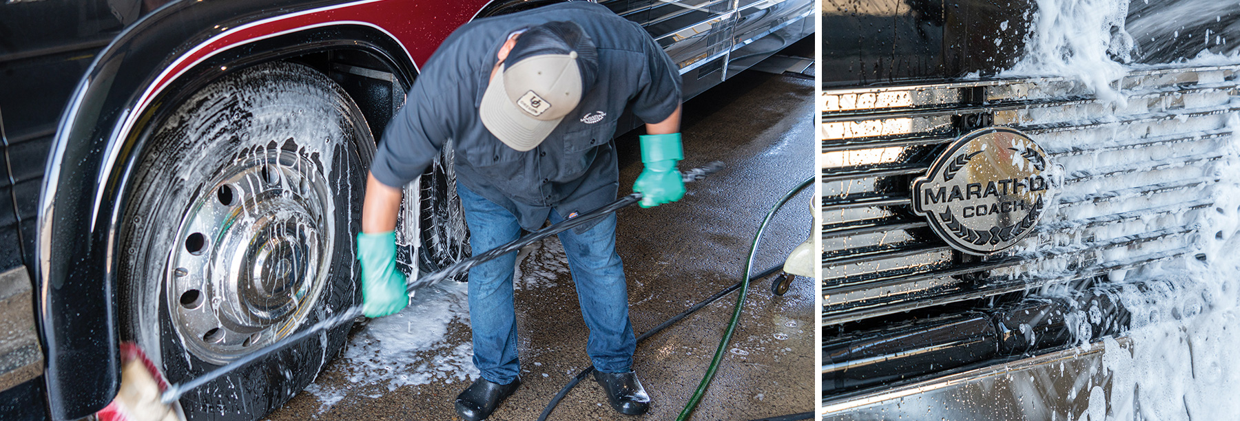 Our service department in Oregon has two detailers on staff whose responsibilities include coach washing. Whether for paint prep, as a finishing touch after a repolish or wax or as a service to our clients after maintenance or upgrade, our detailers use professional equipment and a spot-free water system for a flawless result. There is even a hose and wand tied to a beam in the wash rack to rinse the roof, keeping your Marathon as dazzling as the day it drove off the lot.