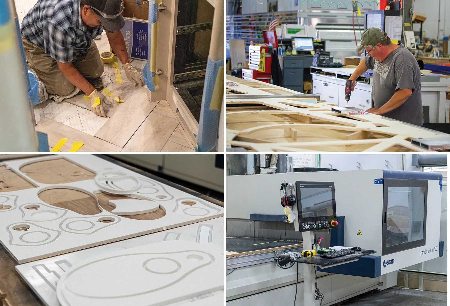 Being the largest bus converter in the world, Marathon can afford to implement new technologies in the production process. Our five-axis CNC (Computer Numerical Control) router machine uses next-level technology that cuts all types of plywood, acrylic, sheet plastics and sheet aluminum into precise, complex shapes. Andy Johnson, part of Marathon's engineering team since 2000, is the CNC programming specialist, while operators Blake Powell and John Trimble work alternately to program and cut Marathon ceiling parts, countertops, cabinets, roof caps and many aluminum flat patterns for the metal shop. What's more, each CNC piece is custom cut using precise engineering plans and labeled with corresponding numbers, streamlining the fabrication and assembly process.
