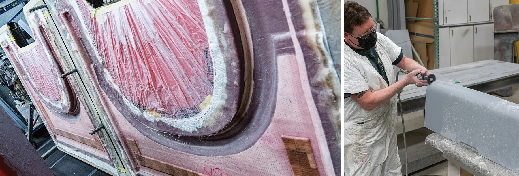 Two decades ago, to the naked eye, luxury buses from different converters looked largely the same. Marathon Coach was the first to really innovate and custom-design exterior composite parts to enhance the appearance and function of the Prevost bus chassis. The unique roof caps over our awnings are a great example of these telltale modifications, and the reason you know a Marathon right away when you see it. At the factory in Coburg, Oregon, we have the machinery, materials and skilled artisans to create just about any interior or exterior components in our coaches. We have two professional fabricators in the composites department, where fiberglass is molded, using a variety of methods and systems, into wheel wells, fenders, roof caps, dashboards, cockpit pieces and other components, including that handy drop door that houses Marathon's patented Freedom Plus sewer hose system.