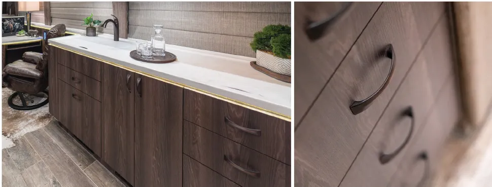 When you walk into a Marathon, you notice the seamless flow from one cabinet to the next. Each drawer and door is perfectly matched with the grain of the laminate that was chosen by the customer or designer. This detailed feature makes a big statement when it comes to the beauty of each coach. Our talented craftspeople take the time to measure and precisely line up every piece of laminate to ensure a smooth finish to your kitchen cabinetry, storage areas and coach accents.