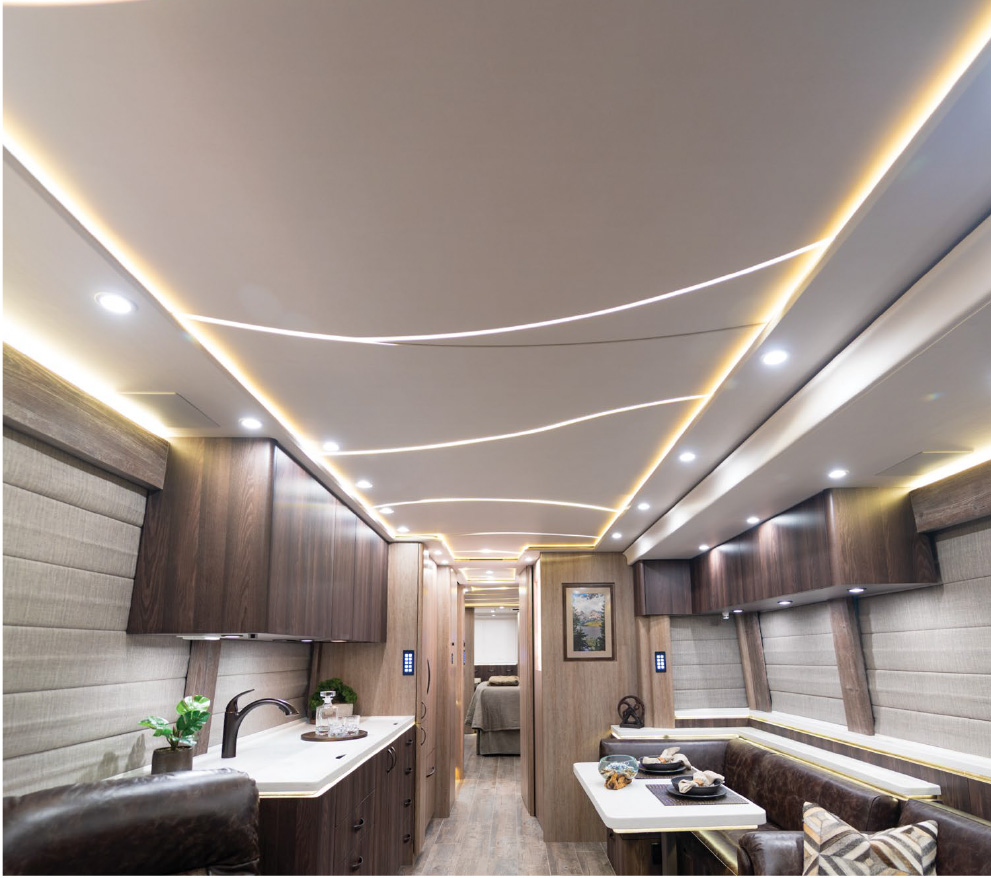 Twenty years of research and development have gone into Marathon's efficient, hidden air-conditioning system and ducting. Most companies use vents that force the air straight down, but Marathon's vents are unique: they can't be seen and they move air in a horizontal flow. Even when the slides are in, this design lets the air drop down and diffuse into the coach, creating perfect circulation when a coach is on the road and when it's not. The ducting is quiet and the design allows for another way to add LED lights to the walls and ceiling. LEDs add a softer source of illumination throughout the coach and virtually eliminate the need for overhead lights. This system - so unique and completely invisible - is just one way Marathon merges function and style in our coaches.