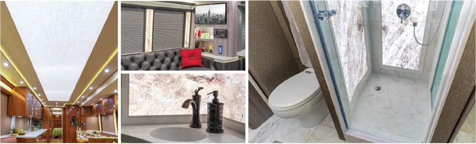 The process of making lighted panels from scratch has evolved greatly over the years, but Marathon's latest evolution is filled with a classy elegance that will illuminate any feature you want. From waterfalls in the shower, to the appearance of flawless stone in the ceiling or backsplash, illuminated panels offer adjustable ambiance to any room. This generation of light panels effectively simulates decorative tile, stone and glass. Using the latest LED technology, these lights are easily programmable and dimmable, as well as energy efficient. Endless color possibilities and customization allow you to make your coach a reflection of your dreams. Marathon takes great pride in its work, and allows the time and manpower that's needed to create such subtle elegance.