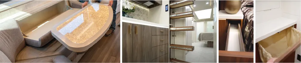 Marathon designers and engineers know that storage inside your coach is a critical element for your travels. From a drop-down compartment above the king-size bed for sheets and blankets, to the dinette seats tipping forward to reveal more storage, you can find many examples of how Marathon engineers have maximized the limited space in a coach so you can take more with you on the road. While there are numerous areas where other manufacturers might leave space empty, Marathon goes the extra mile to allow every possible nook and cranny to be used. Adjustable shelving gives you the ability to make room for larger objects on the fly, ensuring your travels are relaxing and enjoyable no matter what you decide to take with you from home or pick up on the road. Fabric-lined drawers, hidden pantries and LED lighted shelving are just a few of the small comforts we add to every Marathon coach.