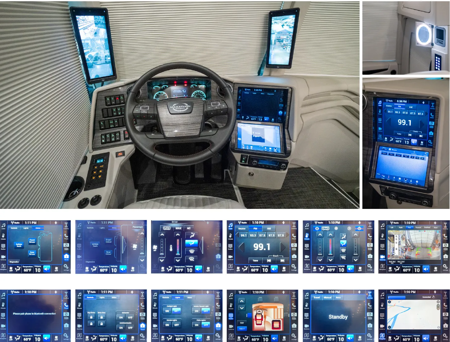 • A new system from Marathon partner Valid Manufacturing that works in conjunction with Crestron, the system Marathon has used since 2001 to control many of its coaches' interior functions such as blinds, HVAC system and audio/video. The Valid system includes a 12-inch Infotainment touchscreen that conveniently integrates many technological features for drivers, including the Sygic Travel GPS navigation and mapping application, Bluetooth radio and hands-free calling. In addition, exterior cameras can be viewed on the screen, enabling drivers to see the perimeter of their coach and check space allowances without leaving the pilot's seat. "All exterior cameras and the 360 system are rolled into this convenient feature," says Graham. "There are cameras for viewing the slide room roofs. There are also several optional cameras, so the system is scalable if the owner wants to add cameras."