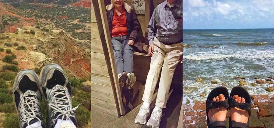 There were plenty of photogenic opportunities for the Nelsons as they meandered to the "Fantastic Florida Keys" rally via Chickahomony Pond, Ore.; Ogden, Utah; Rawlins, Wyo.; Littleton, Colo.; Trinidad, Colo.; Palo Duro Canyon, located in north Texas; Marathon Coach Texas, located in Grand Prairie; Canyon Lake, Texas (Alice's brother's house); College Station, Texas (George Bush Library); Galveston, Texas (to see the Houston Space Center); New Orleans (for food!); Fort Pickens, Fla.; Marathon Coach Florida, located in San Antonio; Fort Meyers, Fla. (to see Linda and Jim Brann - Alice's relatives); and, of course, Bluewater Key RV Resort, Fla. for the rally. We can only imagine what they saw on the return trip. Pictured here are Gary and Alice's feet at the Colorado History Museum, Gary's feet at Palo Duro Canyon State Park and Gary's shoes at Trinidad Lake State Park. We're told Gary gets more camera time because his feet are larger and show up better in photos as a result.