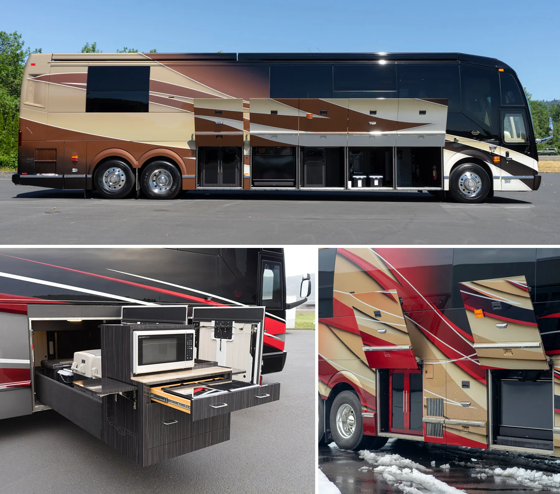 Whether choosing an H3-45 or an X3-45, Marathon coach owners know they'll have abundant basement storage for whatever they need. Some select the H3-45 for its contemporary lines and full body paint - others choose it because it offers approximately 500 cubic feet of underfloor and conversion space. Of course, those who decide on the classic styling of the X3-45 with its polished stainless steel sides enjoy the highest interior headroom as well as an ample 400+ cubic feet of storage space. Although the dimensions vary depending on the type of coach, the space underneath can be transformed in a variety of interesting ways, from installing wine coolers and freezers to storage cabinets and closets. The ways to personalize your experience are endless. We've constructed a feline retreat, complete with playhouse, custom-made cabinets and rope staircase, a teenager's private gaming area and lounge, storage for dirt bikes, golf carts and more. If you can imagine it, we can make it a reality. Want to know more? Contact your favorite Marathon sales professional today or email Marathon's concierge at concierge@marathoncoach.com.
