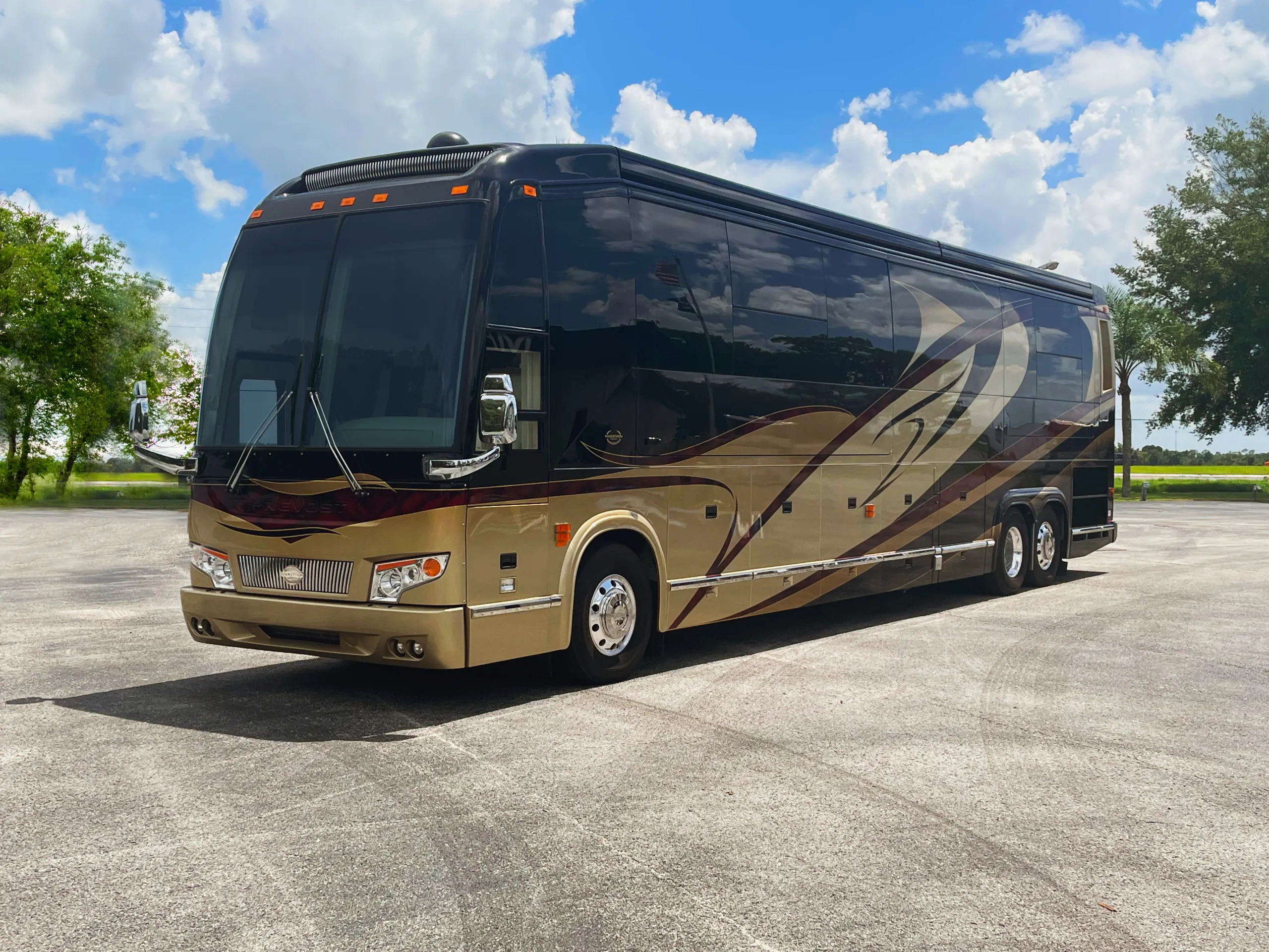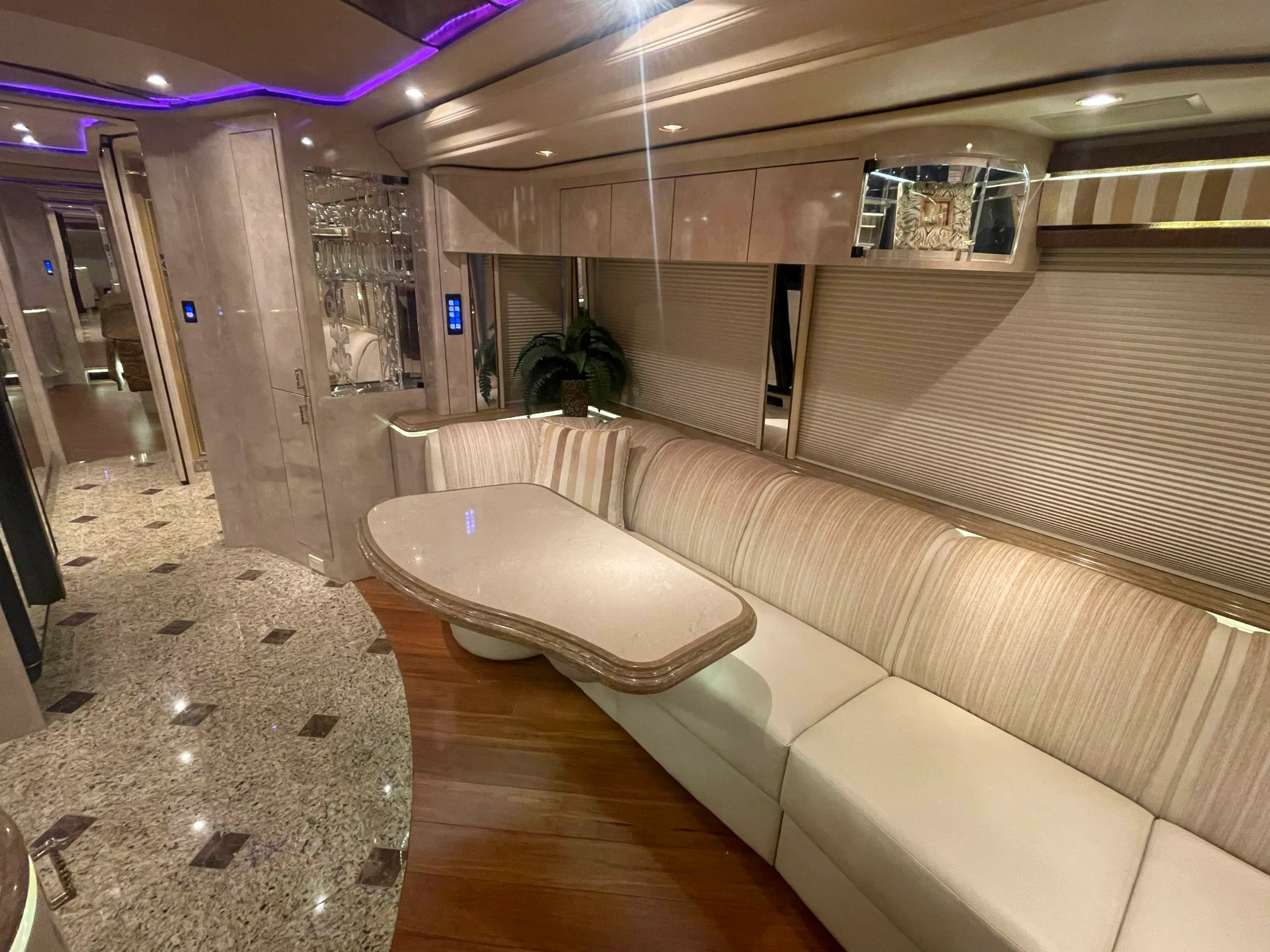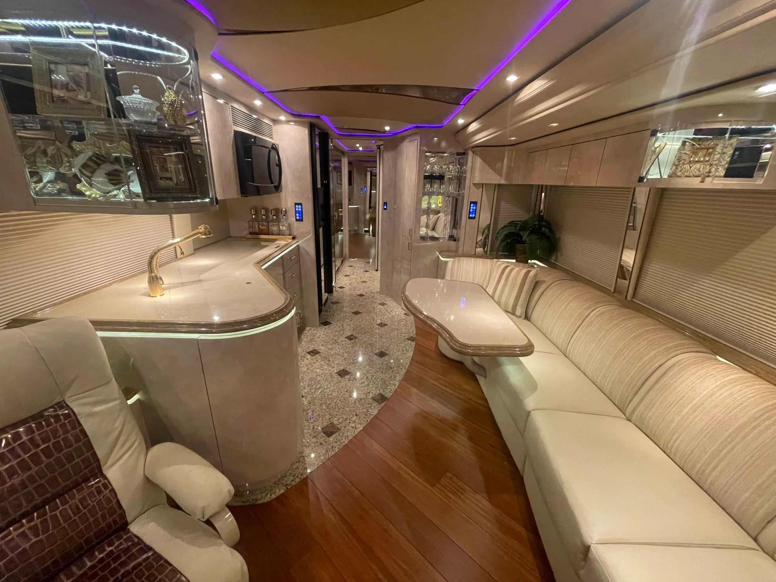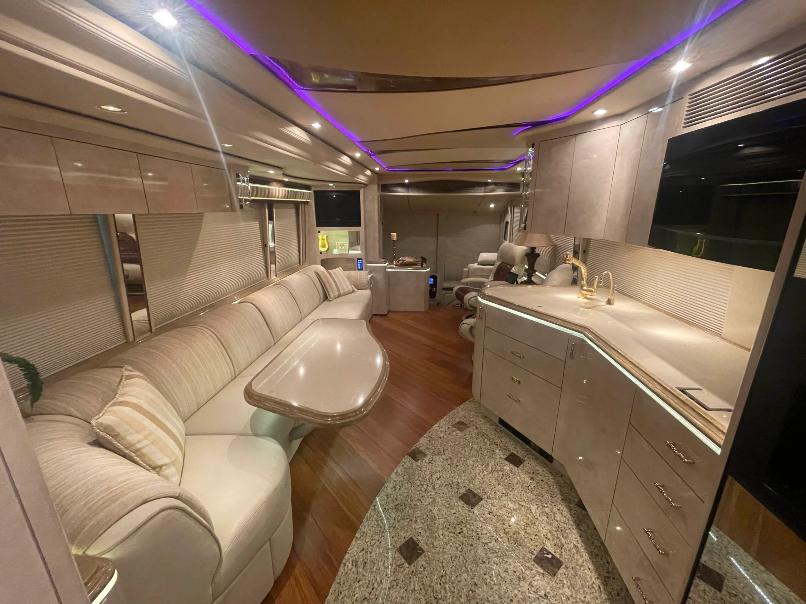 FEATURES SNAPSHOT\n\n● Crestron Control System w/ Surround Sound\n● Girard Automatic Awning Package with Fairings\n● Granite layout with Keys (Galley and Bath)\n● Patented Freedom Plus Sewer System\n● Temperature Sensing Shower Valve