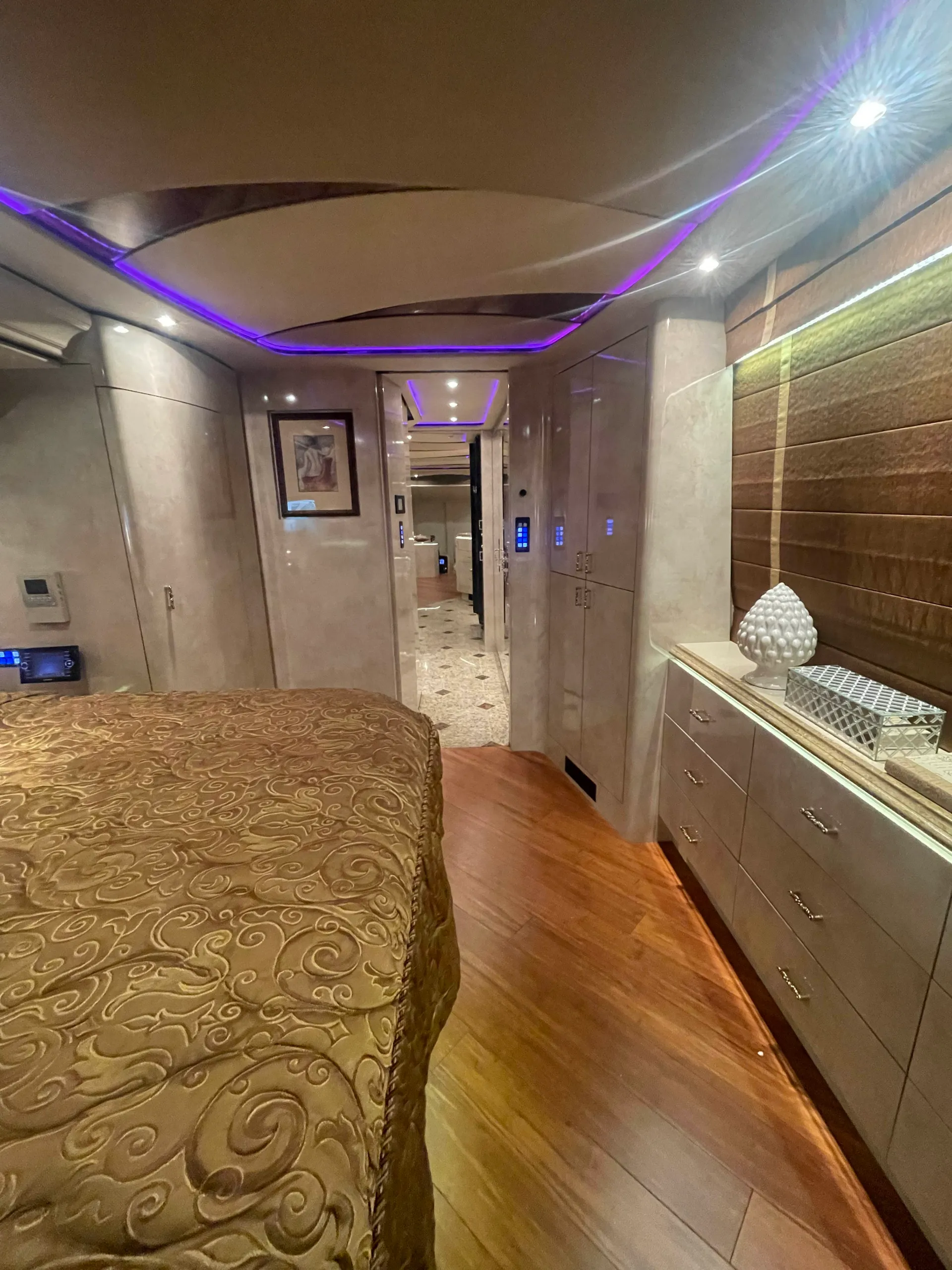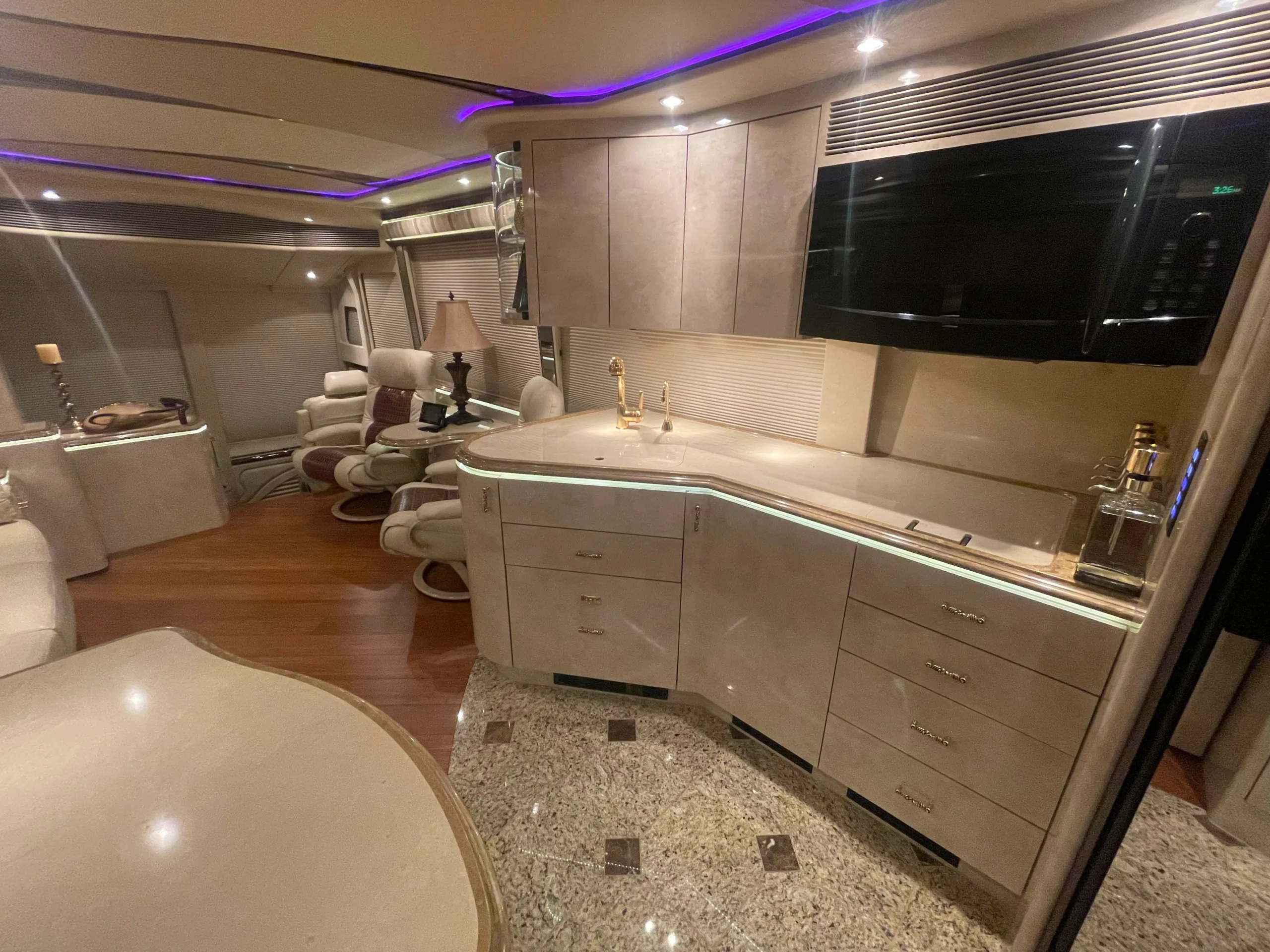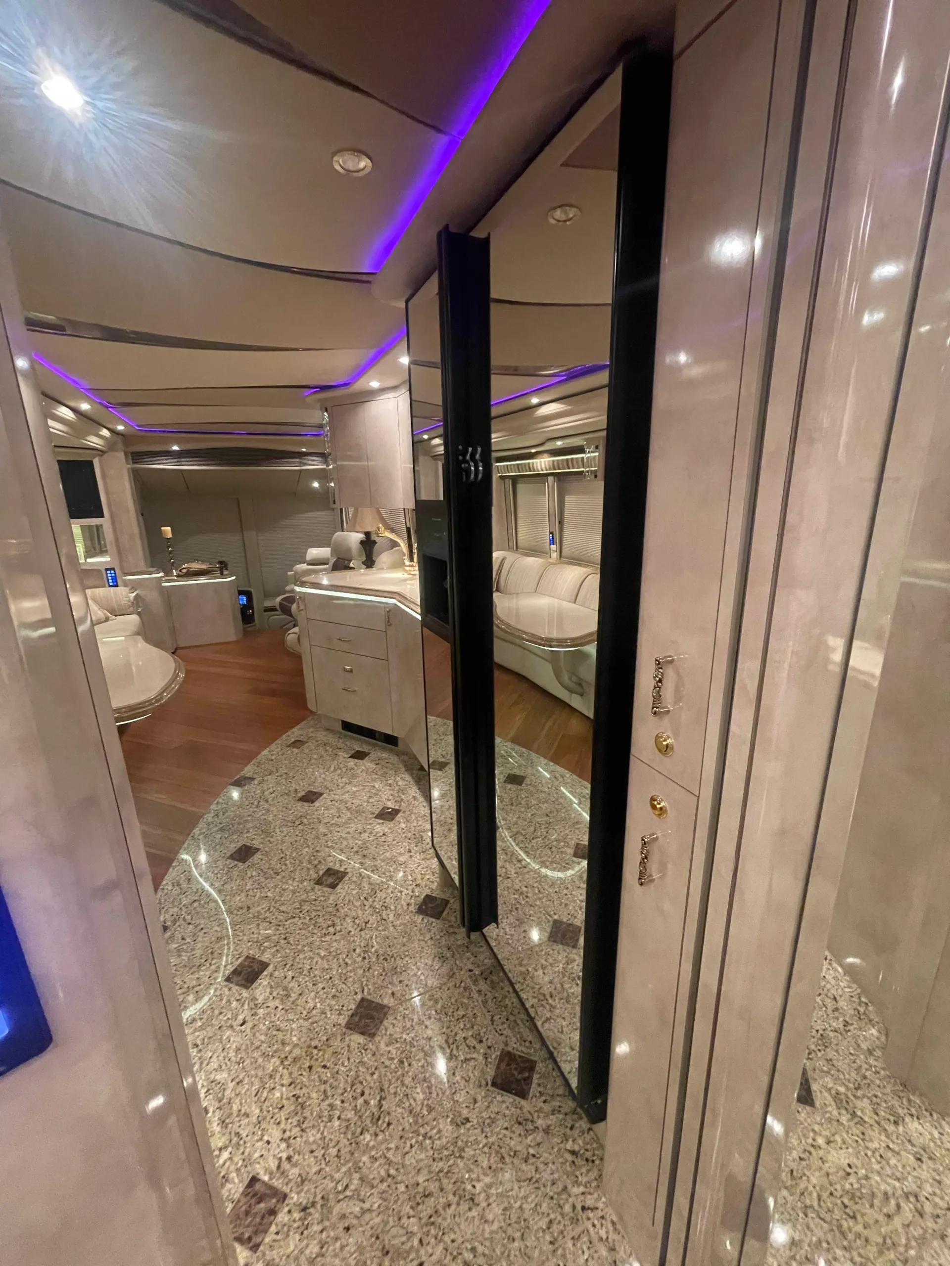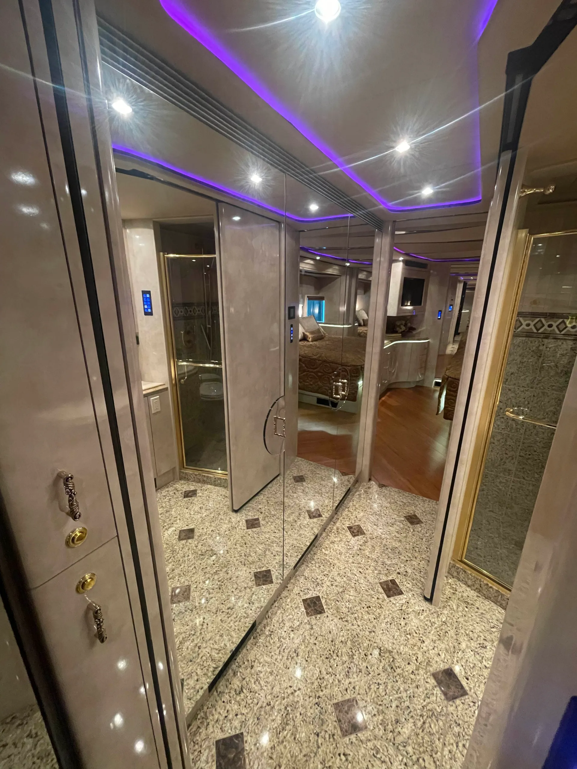 FEATURES SNAPSHOT\n\n● Crestron Control System w/ Surround Sound\n● Girard Automatic Awning Package with Fairings\n● Granite layout with Keys (Galley and Bath)\n● Patented Freedom Plus Sewer System\n● Temperature Sensing Shower Valve