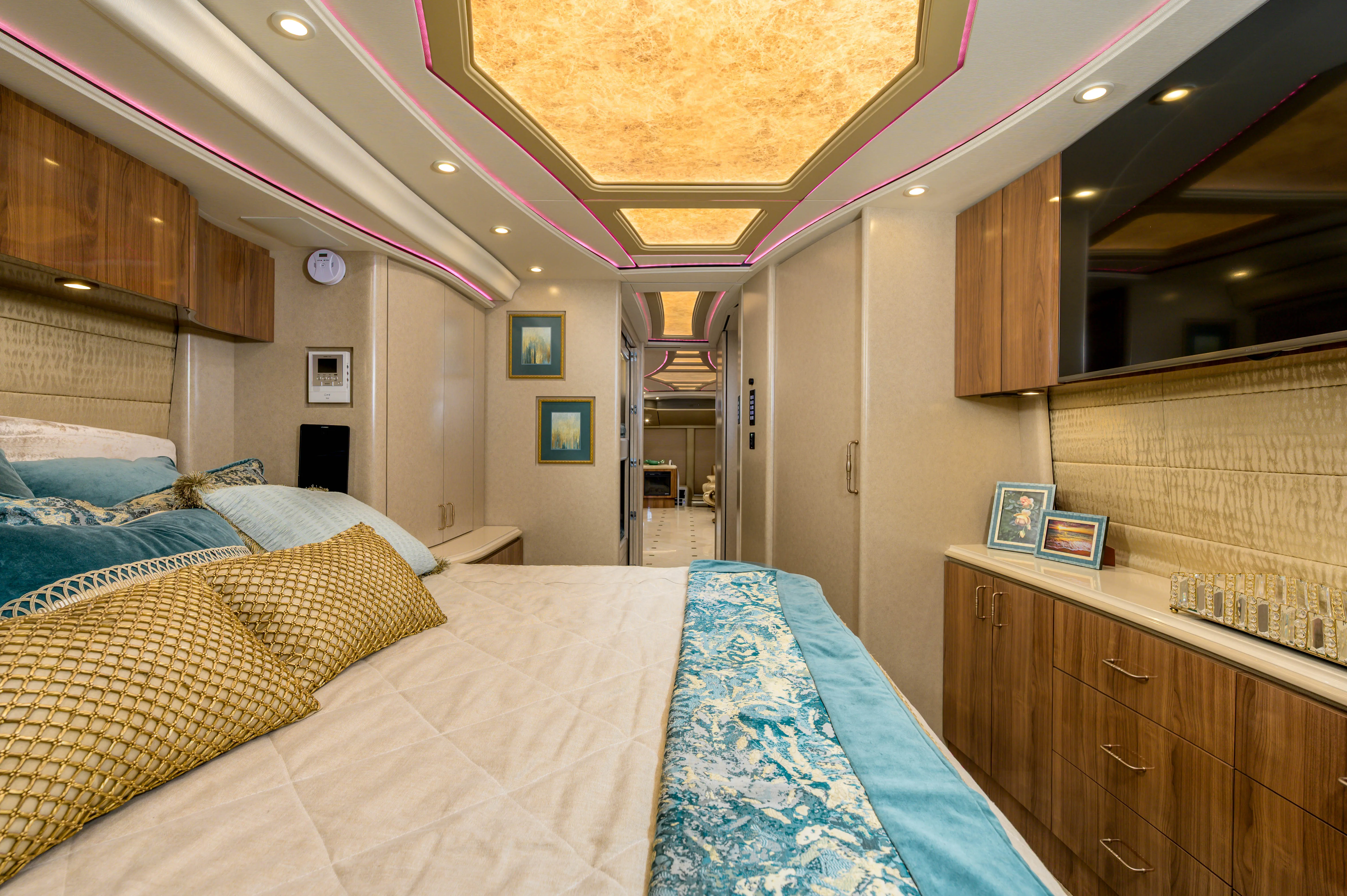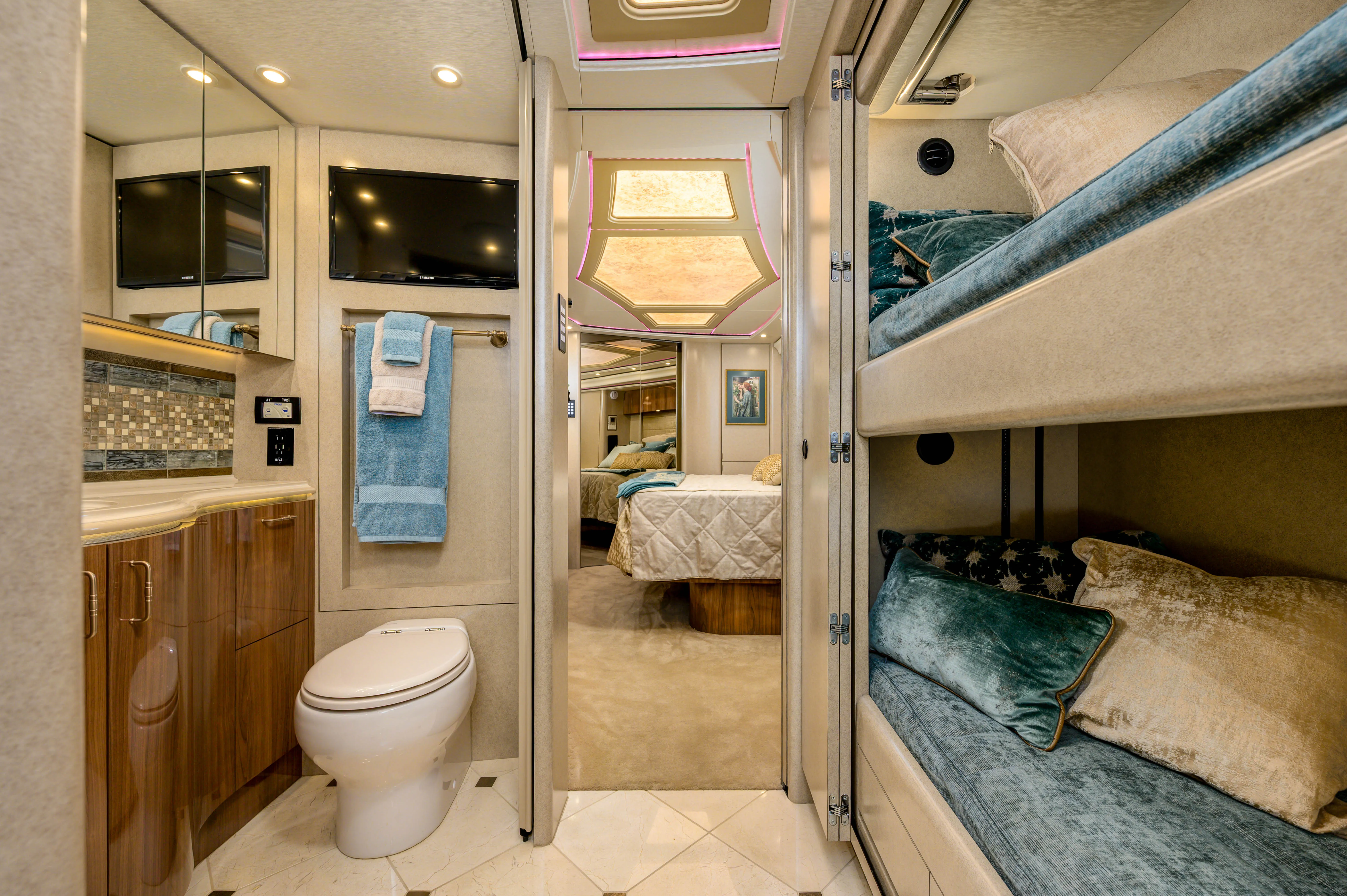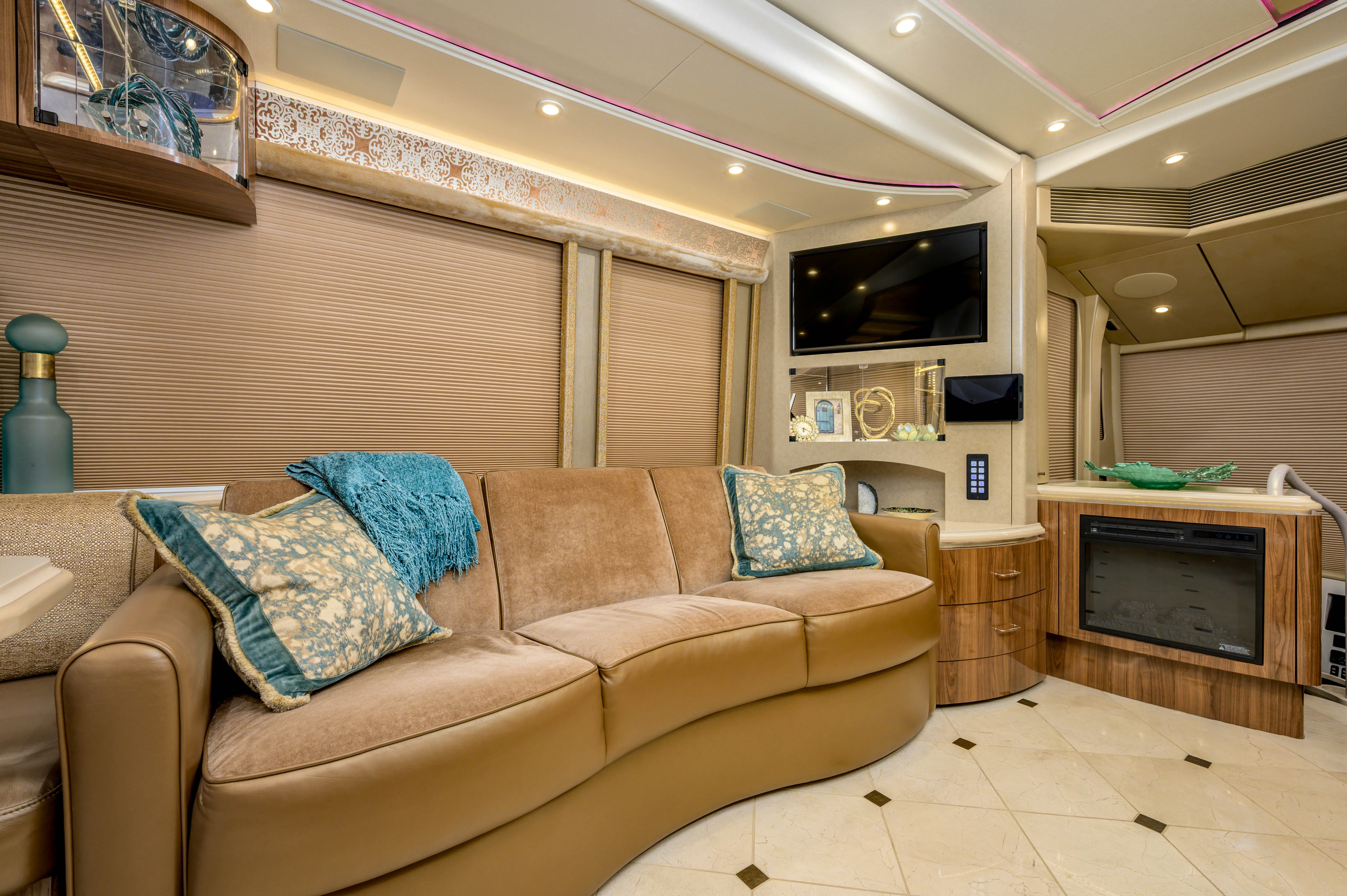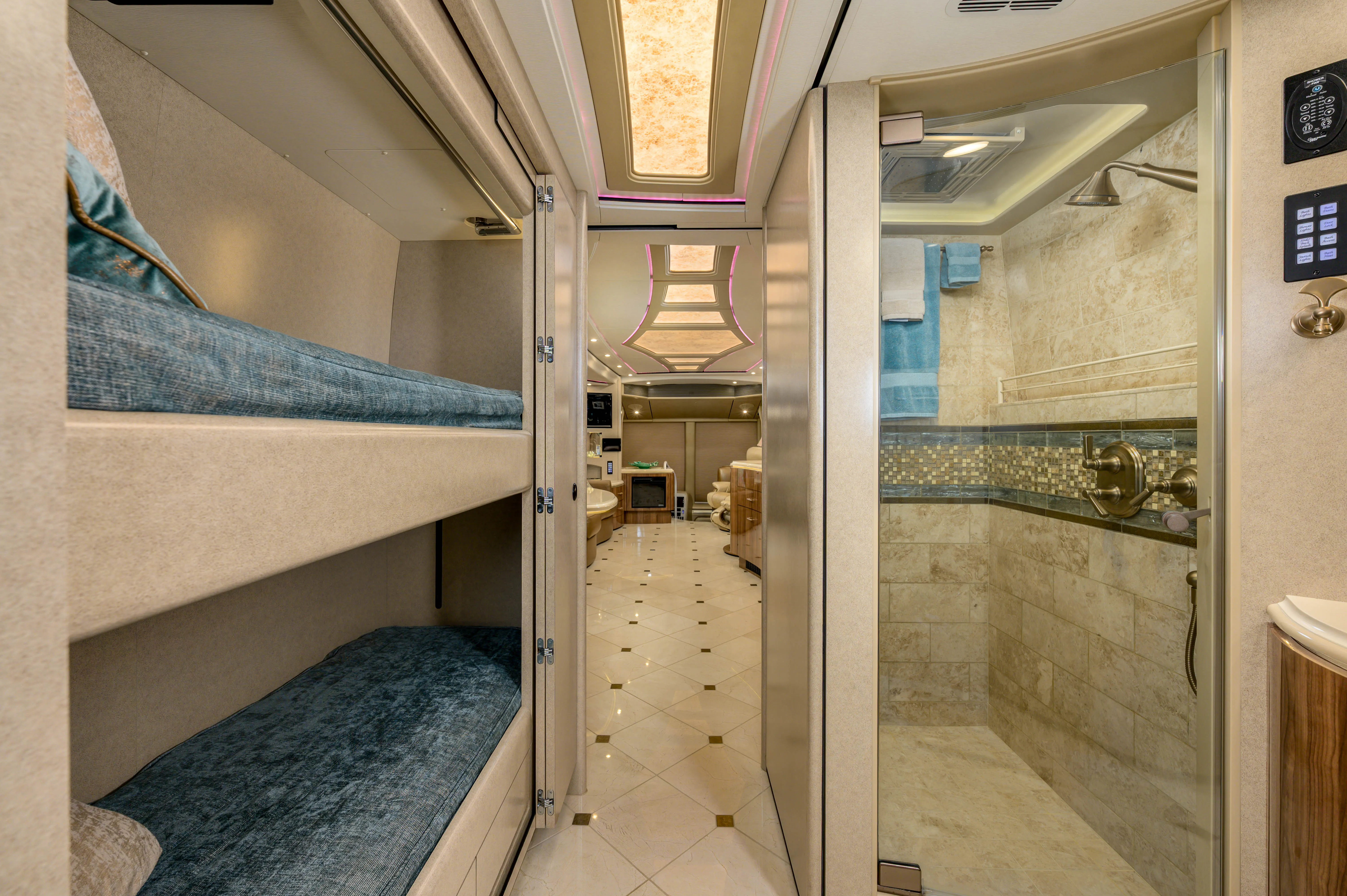 Integrated Crestron controls support intuitive management of key systems, while Prevost driver-assist technology and robust off-grid power capability reinforce confidence on longer trips.