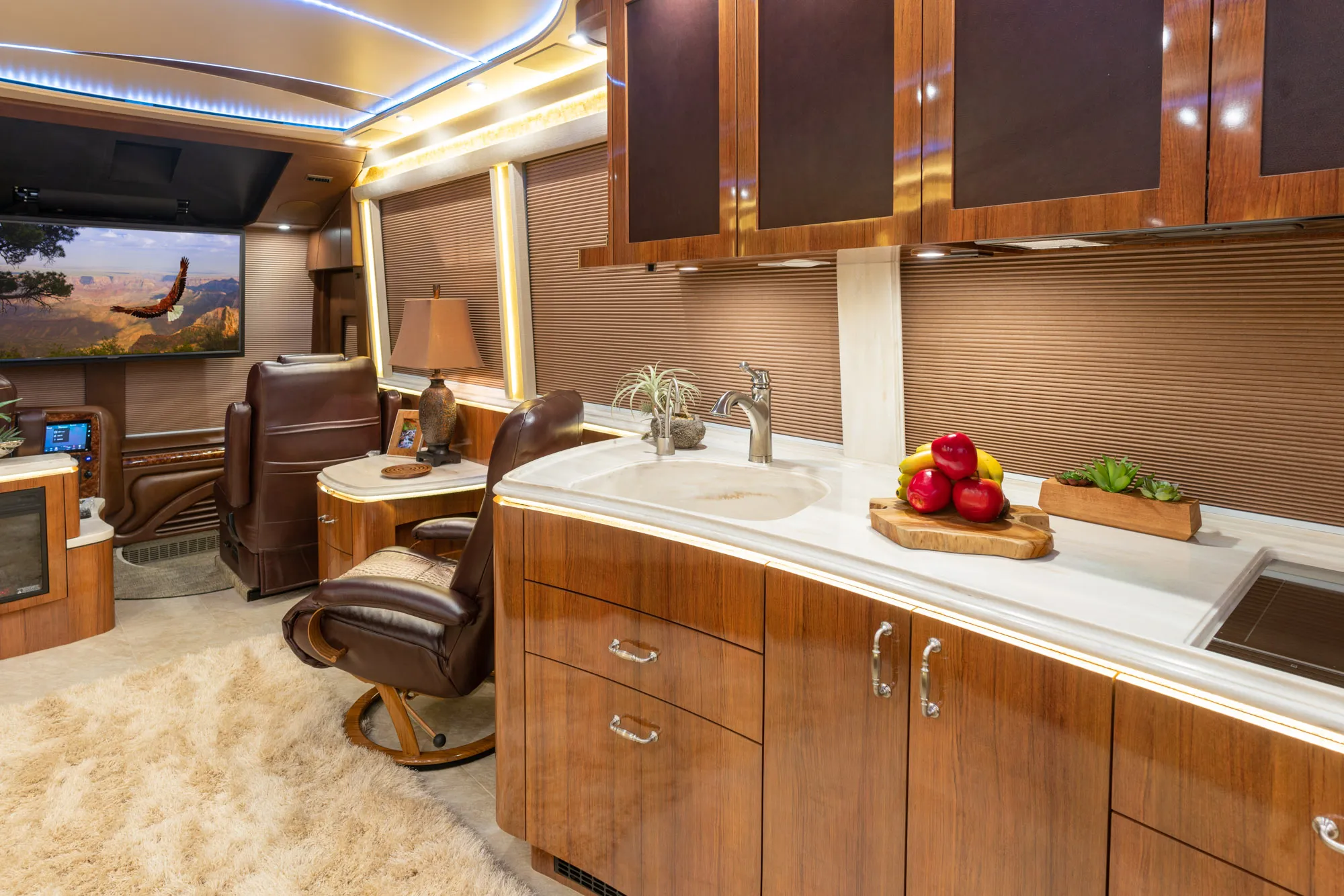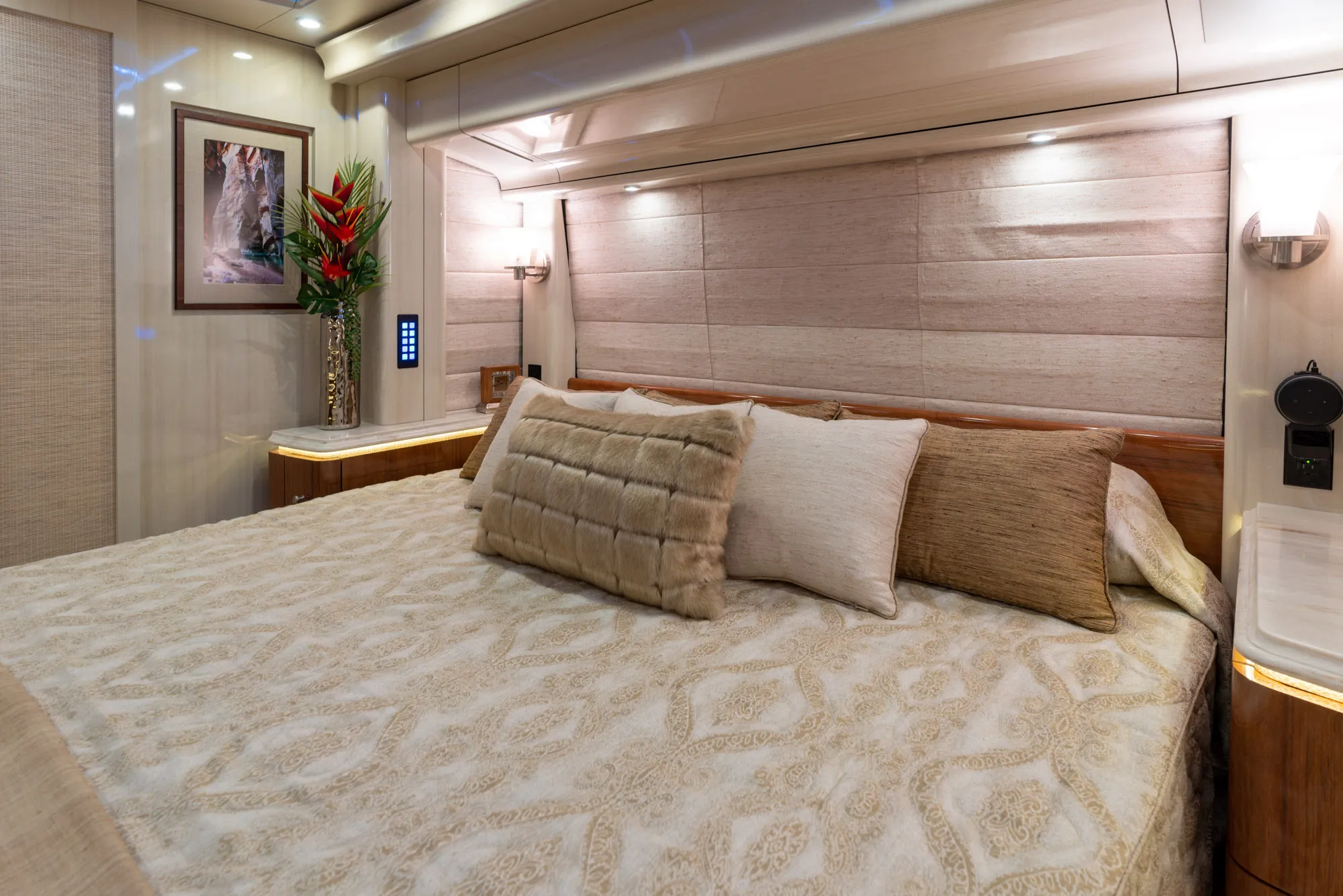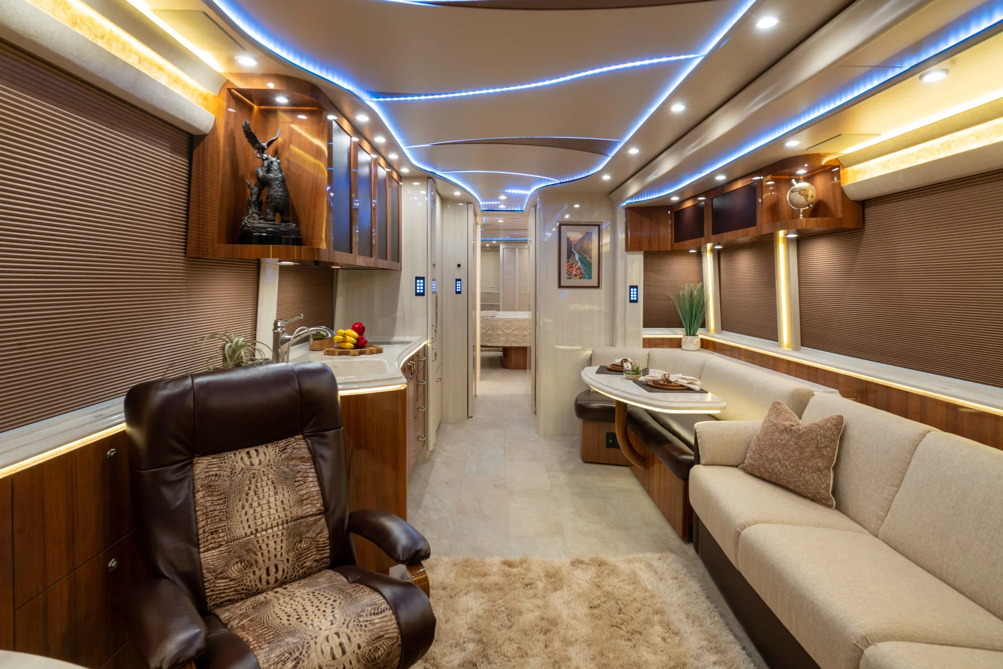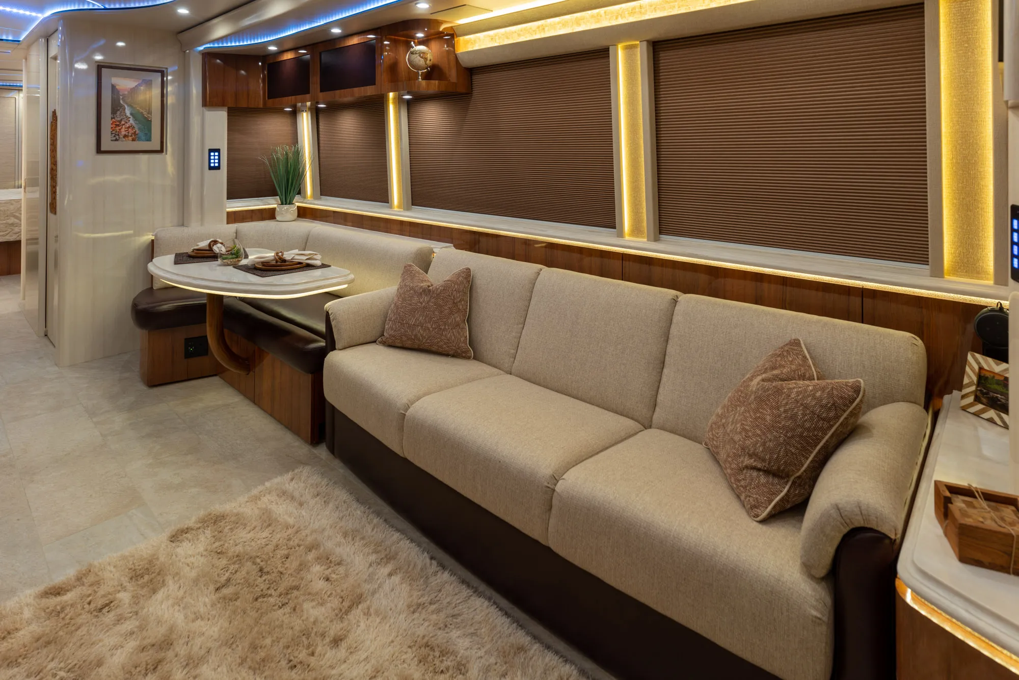 This 2021 Marathon Coach is built on the Prevost X3-45 chassis and reflects a contemporary approach to both design and functionality. The double-slide layout provides a balanced interior footprint that feels open while remaining efficient and easy to manage.