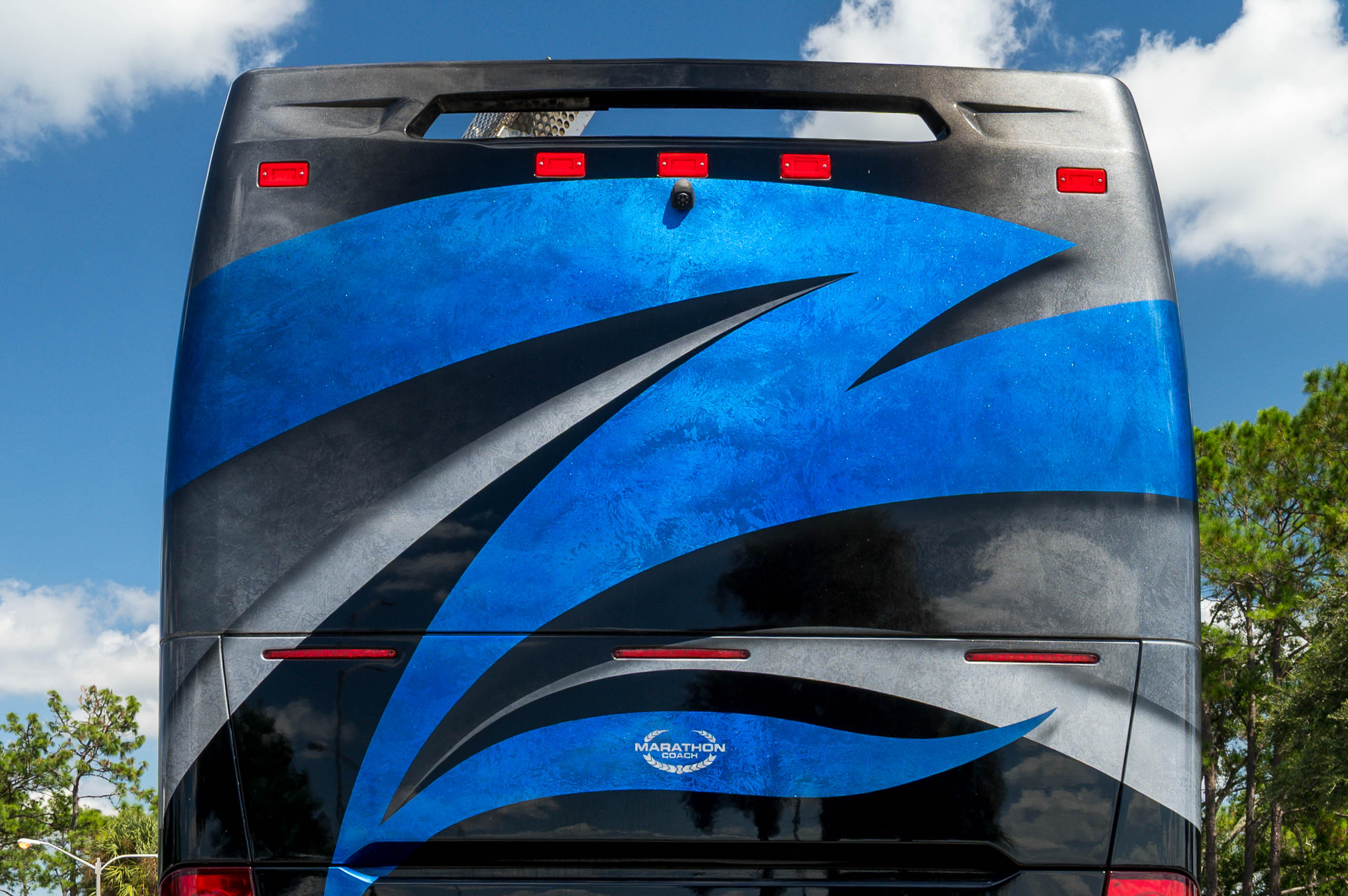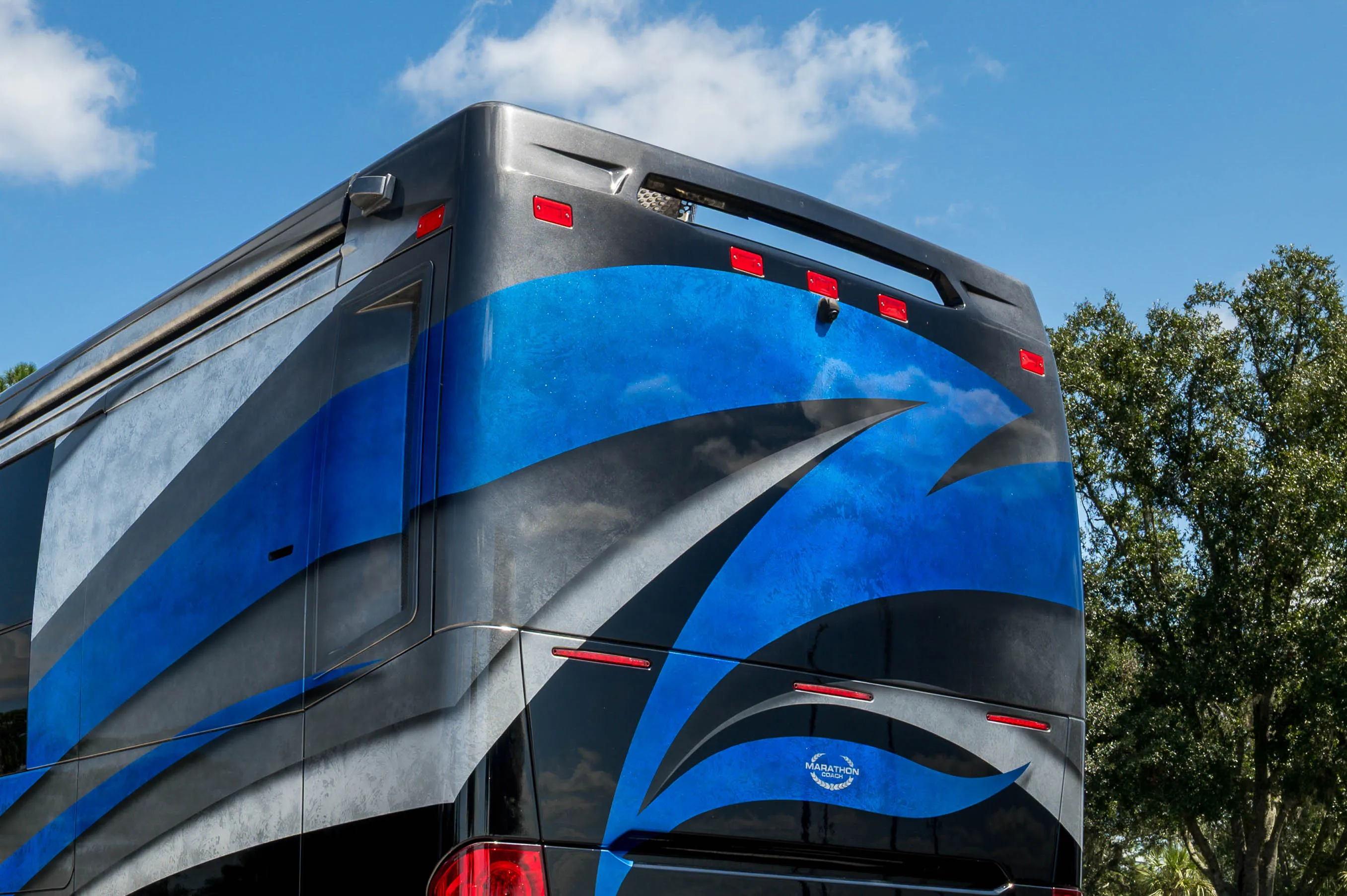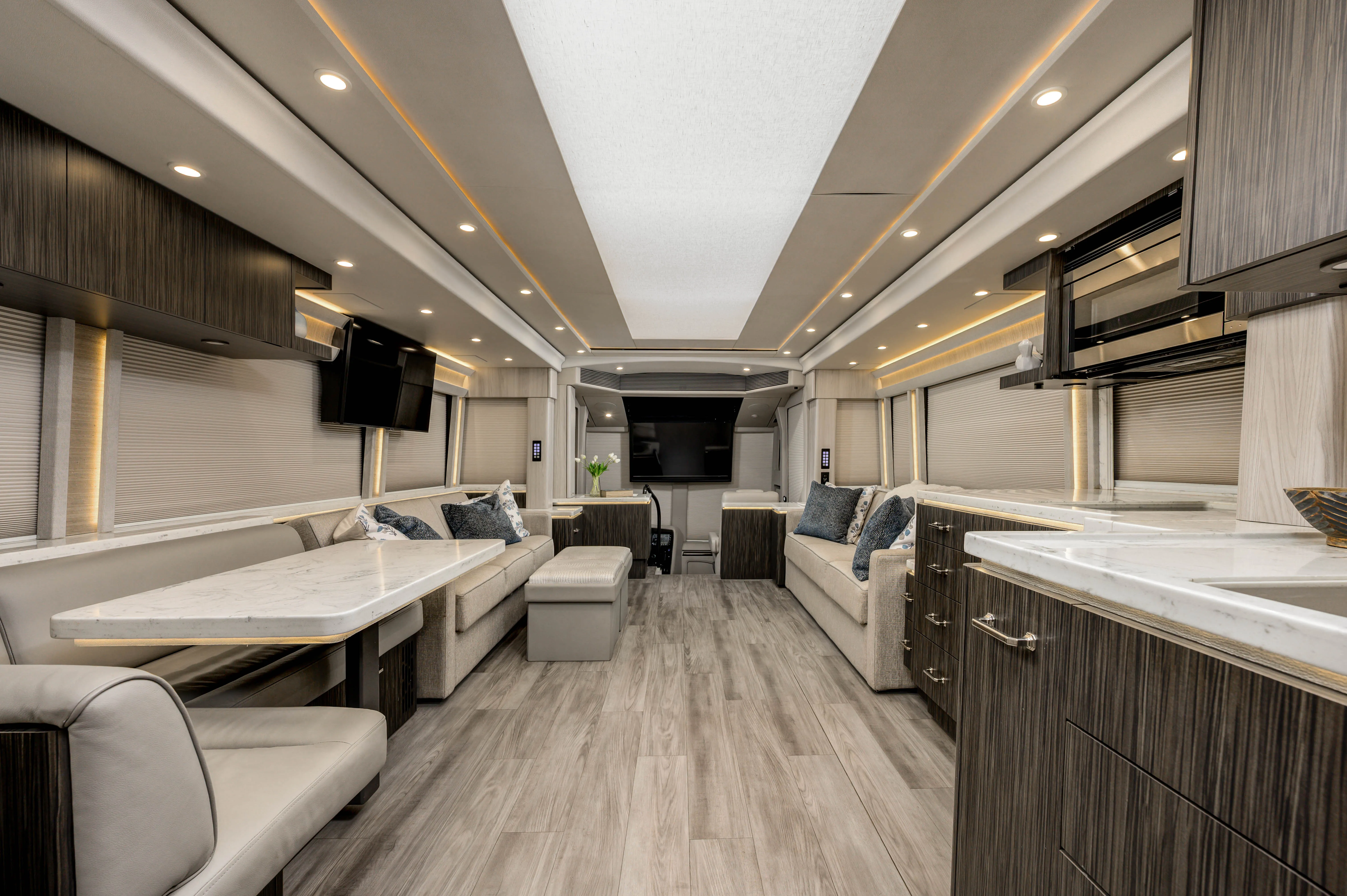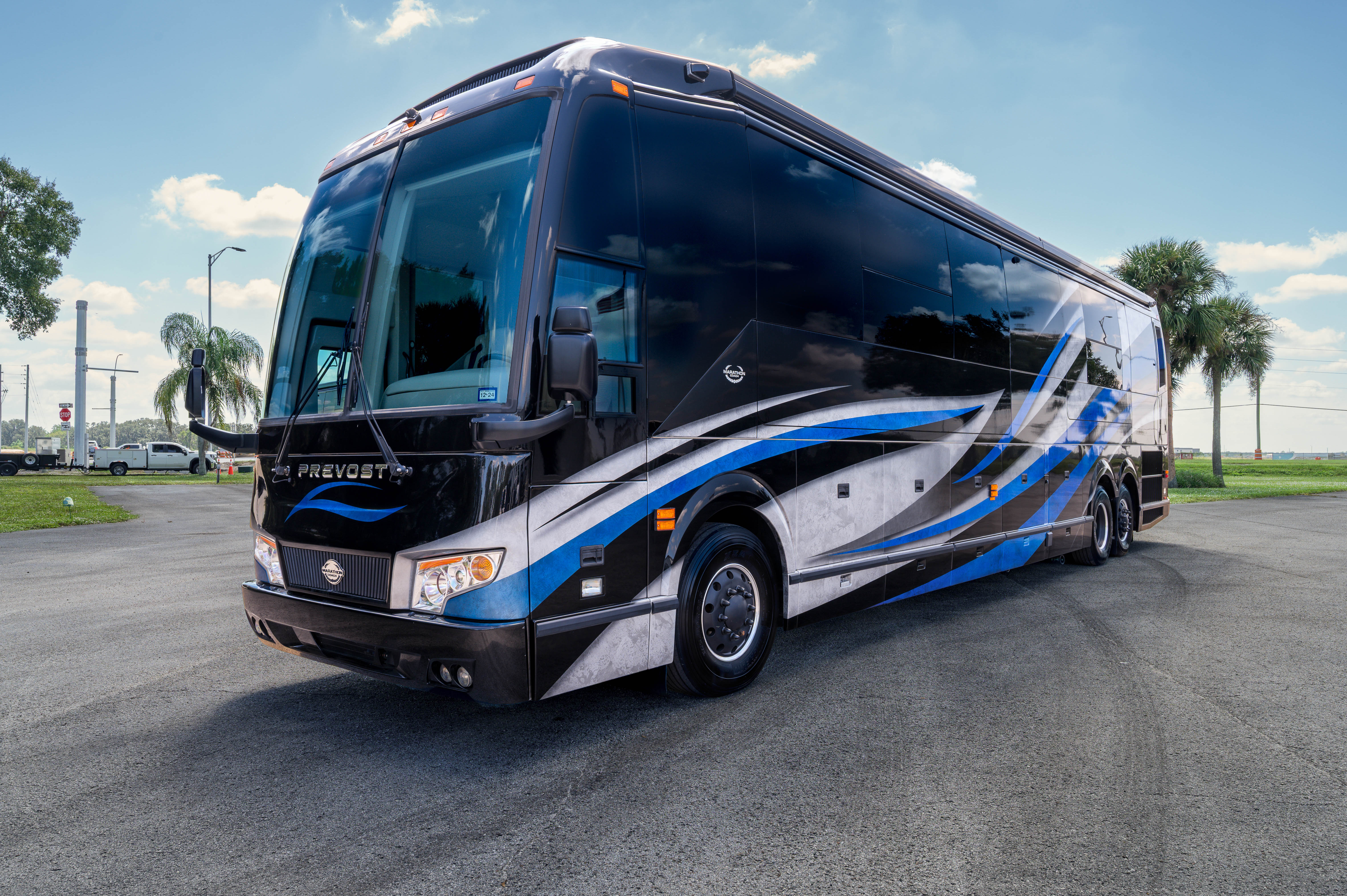This 2021 Marathon Coach on the Prevost H3-45 chassis is configured around interior comfort and livability, featuring a quad-slide layout that creates a truly open residential feel.