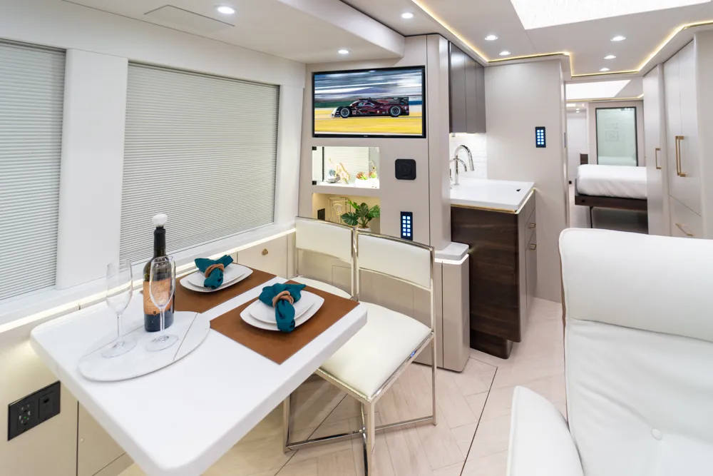 The interior layout balances comfort and function, making the coach approachable for both travel and longer stays.