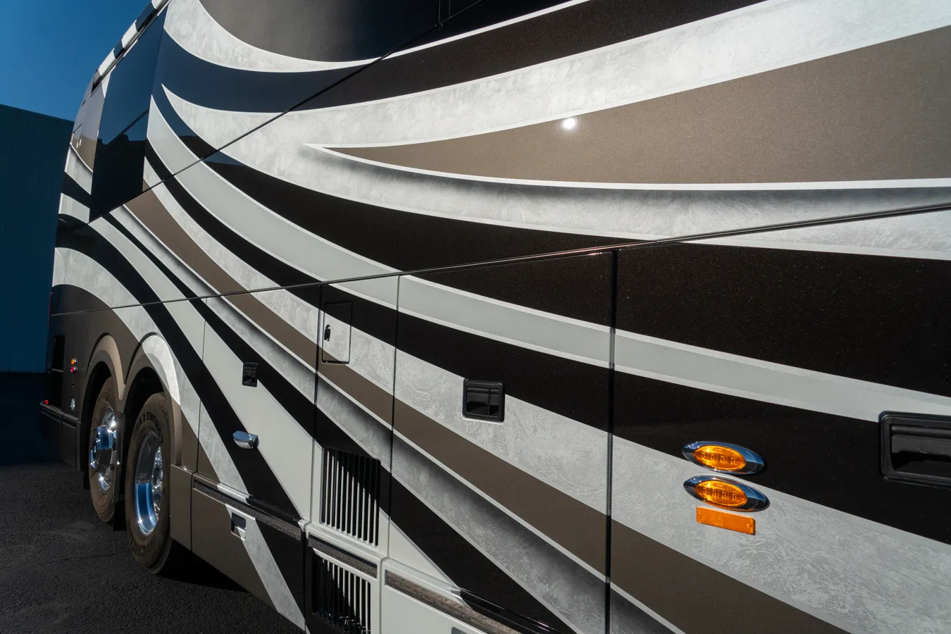 A 2025 Marathon Coach on the Prevost H3-45 chassis with a double-slide layout, Crestron surround sound, strong off-grid capability, and Marathon patented systems for confident ownership.
