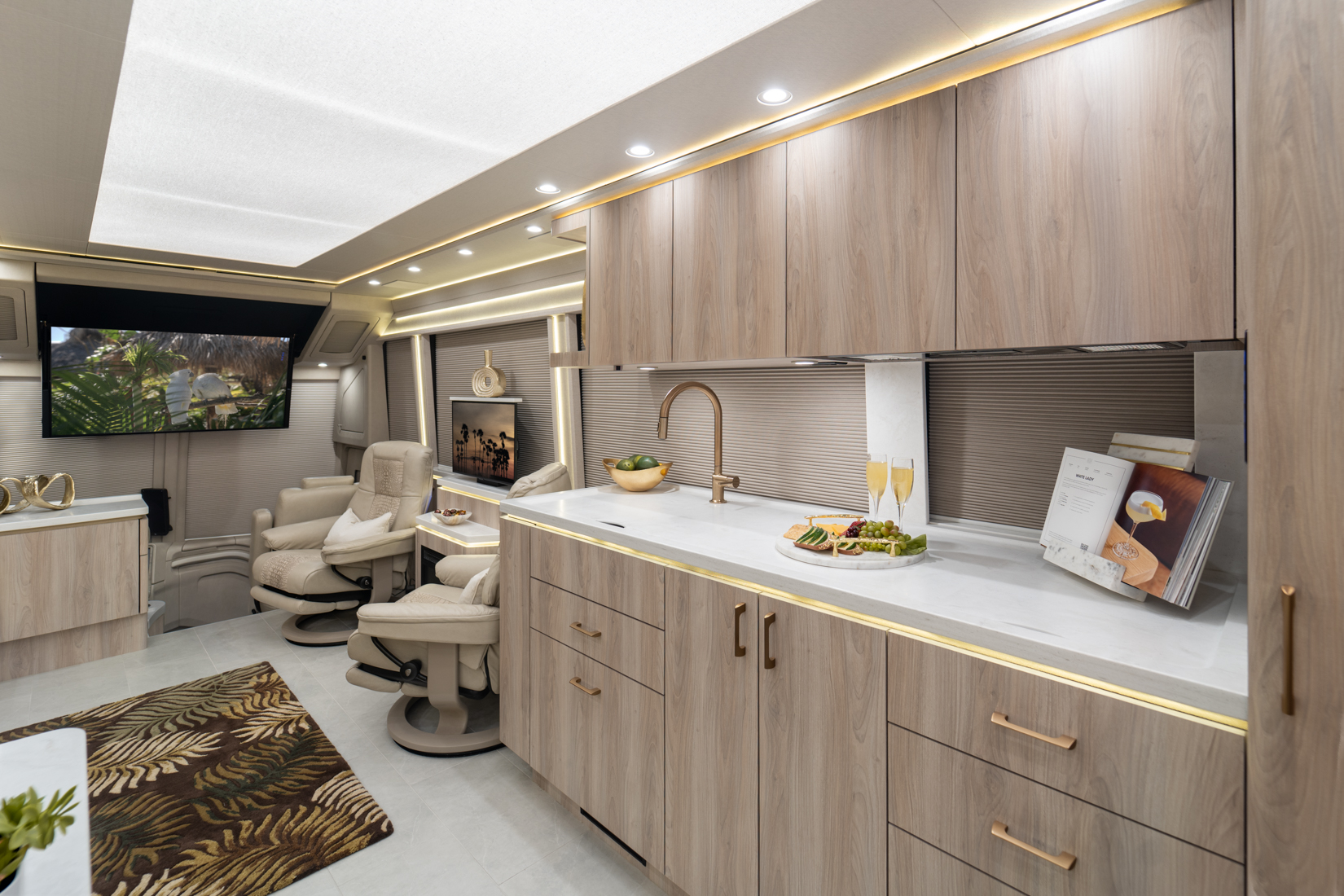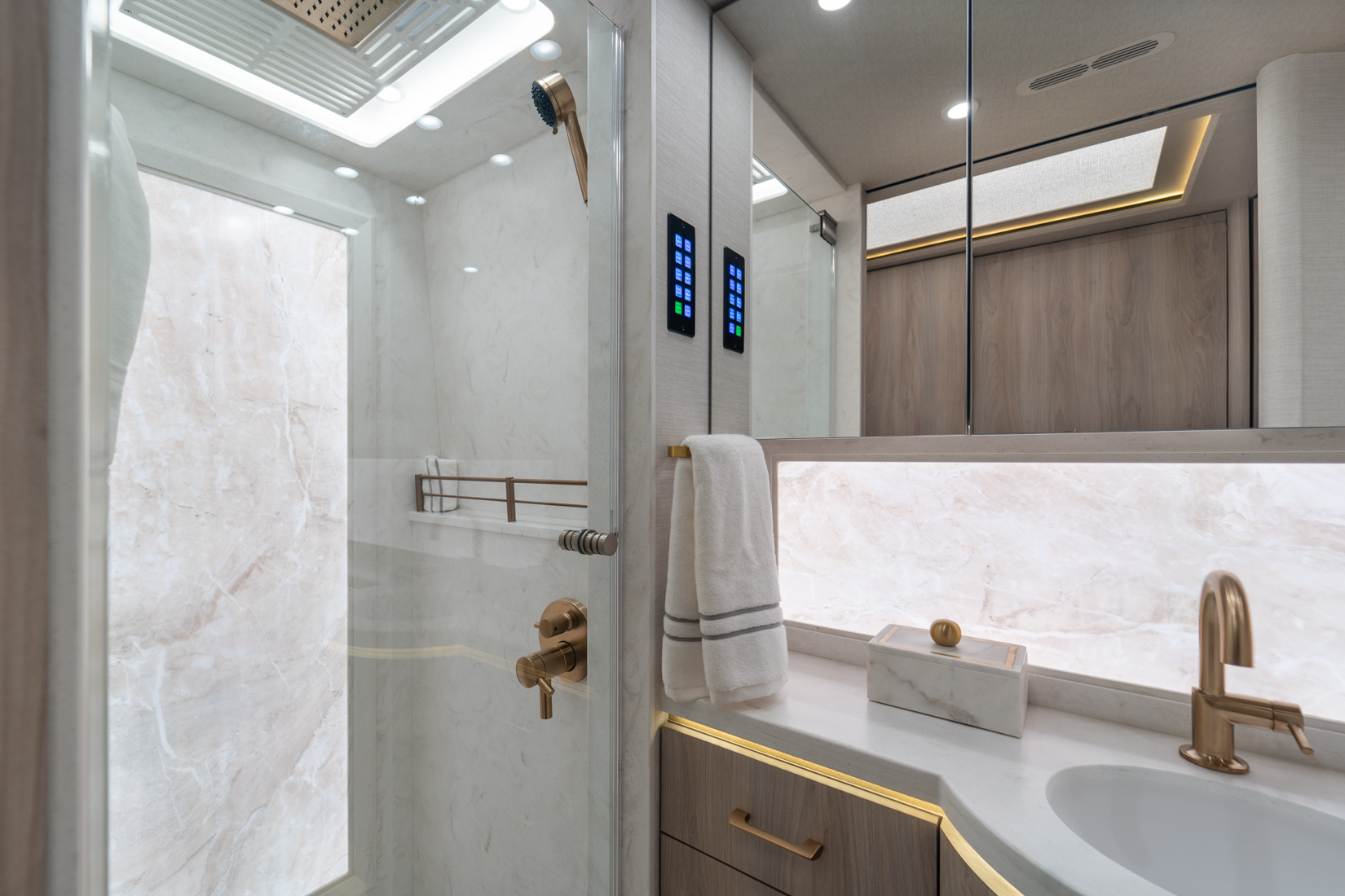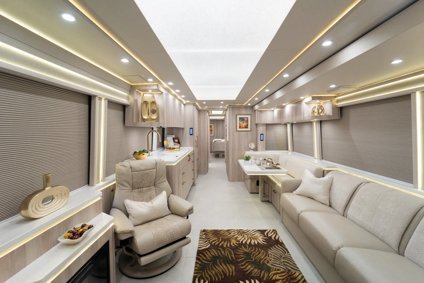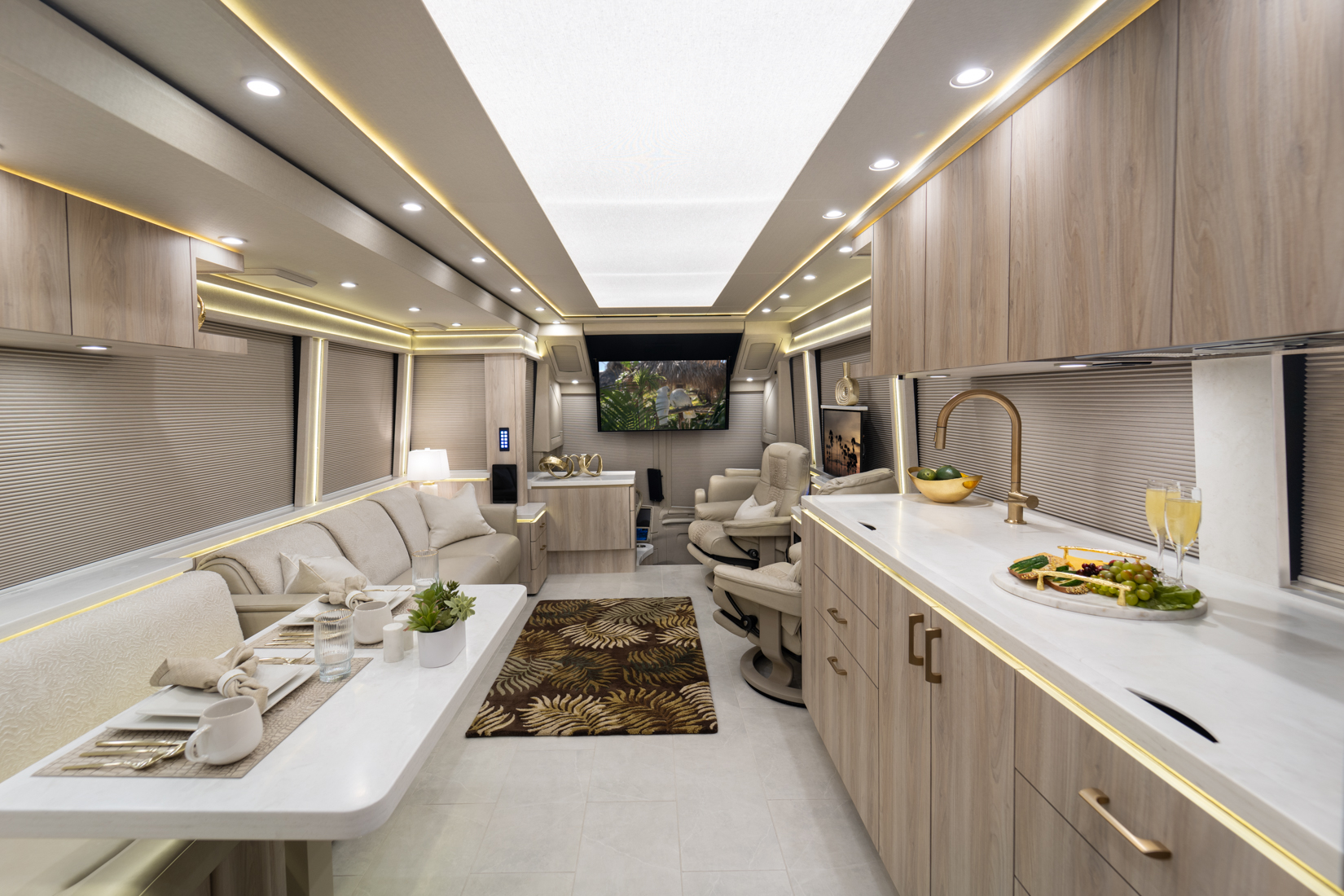 FEATURES SNAPSHOT\n● Crestron Audio with Surround Sound\n● Girard Automatic Awning Package with Fairings\n● 20 KW Kohler Generator with Auto-Gen\n● Patented Freedom Plus Sewer System\n● Patented TechLink Electrical System