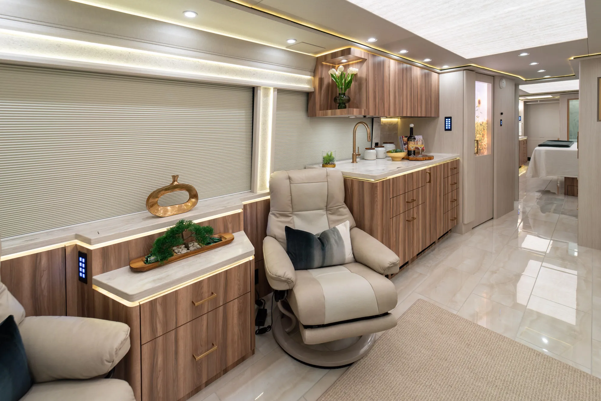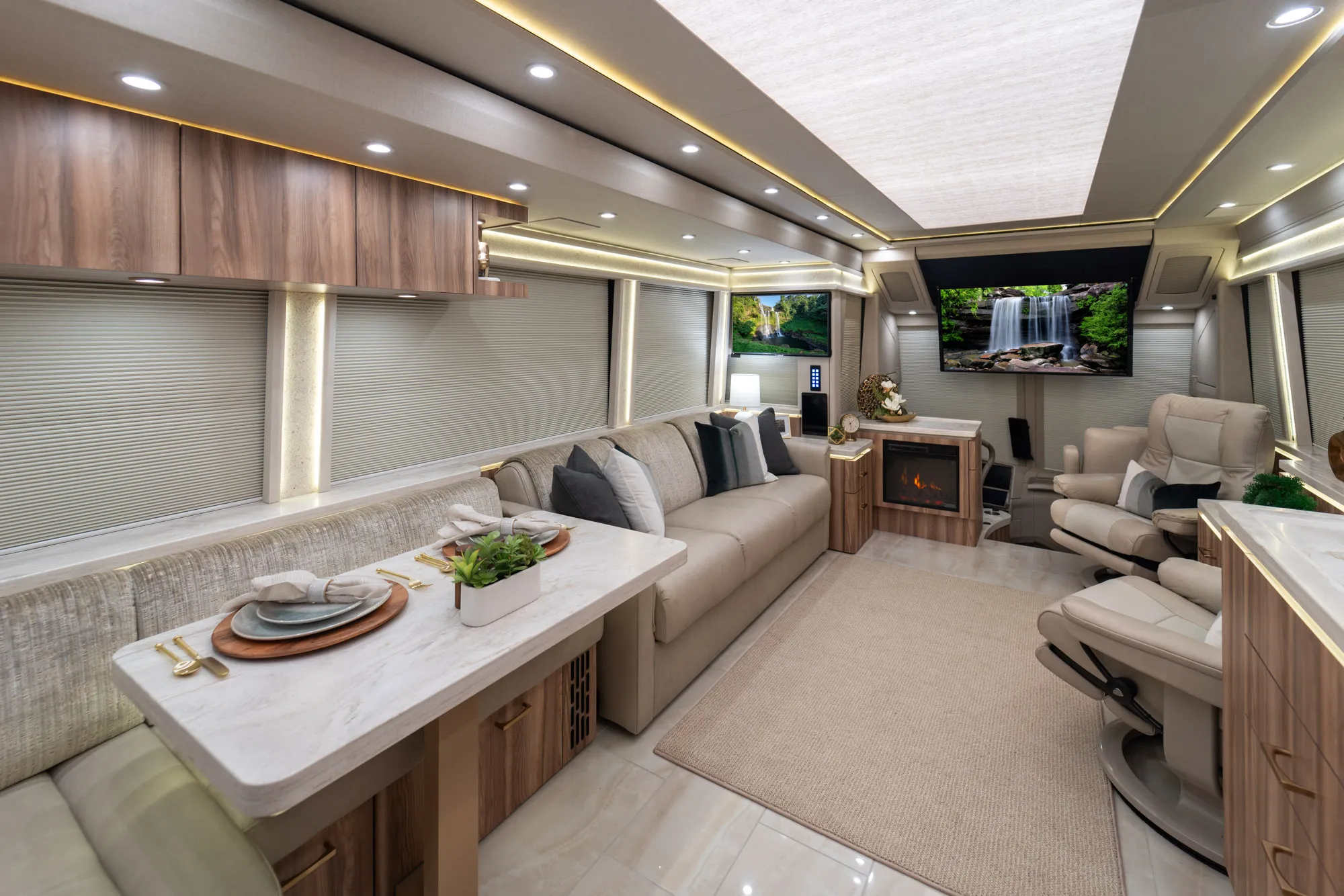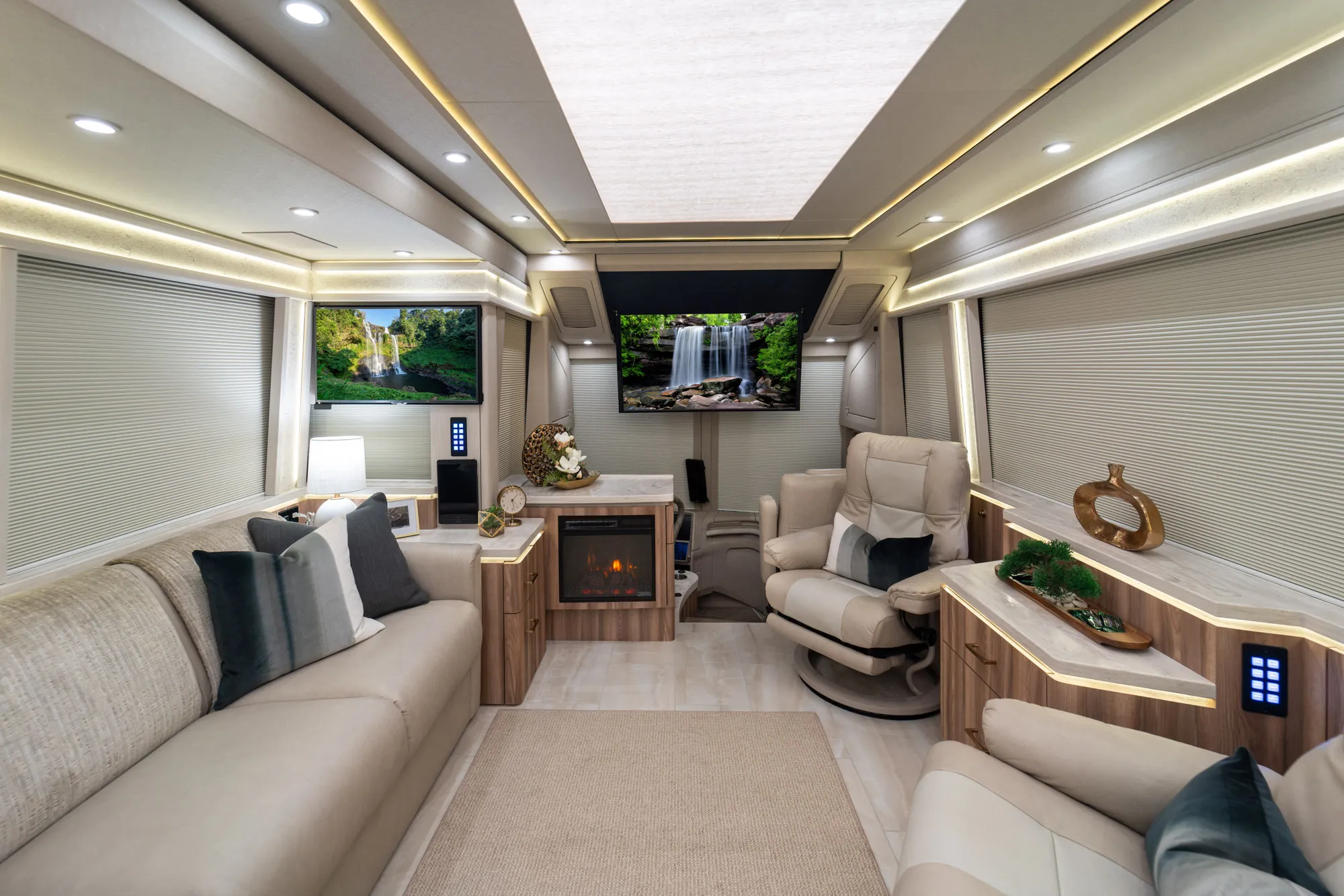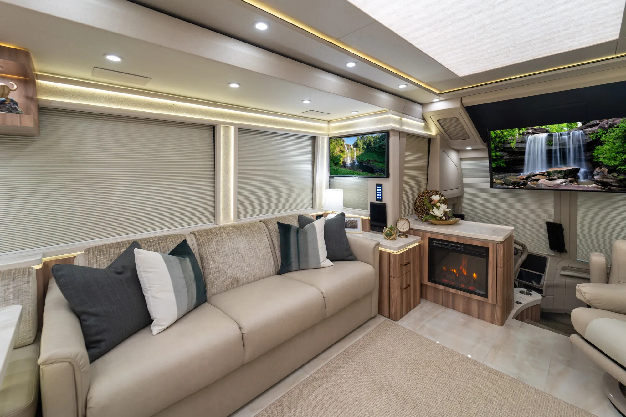 FEATURES SNAPSHOT\n● Crestron Audio with Surround Sound\n● Girard Automatic Awning Package with Fairings\n● 20 KW Kohler Generator with Auto-Gen\n● Patented Freedom Plus Sewer System\n● Patented TechLink Electrical System