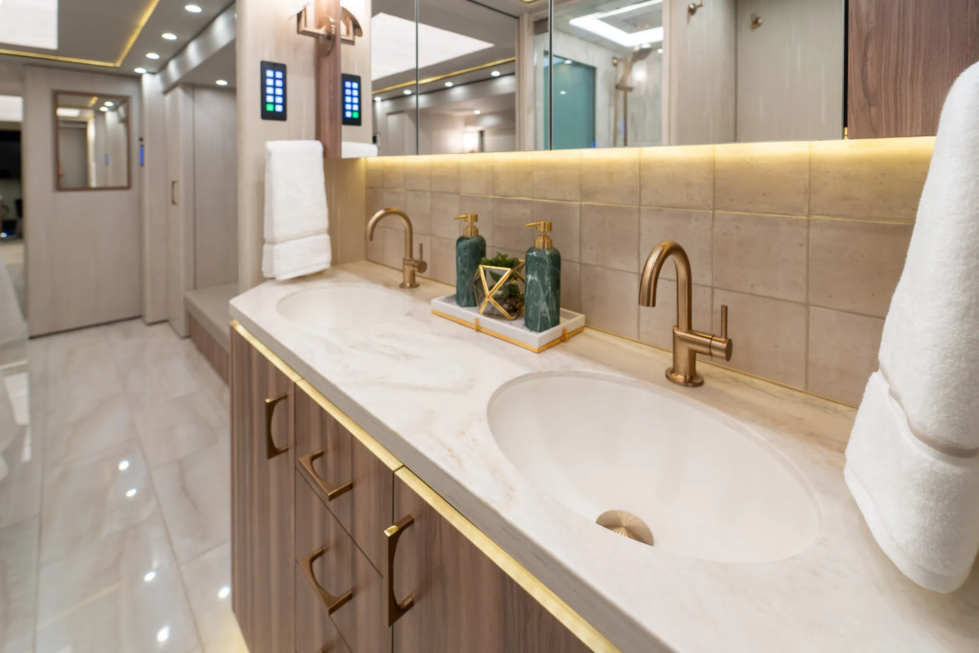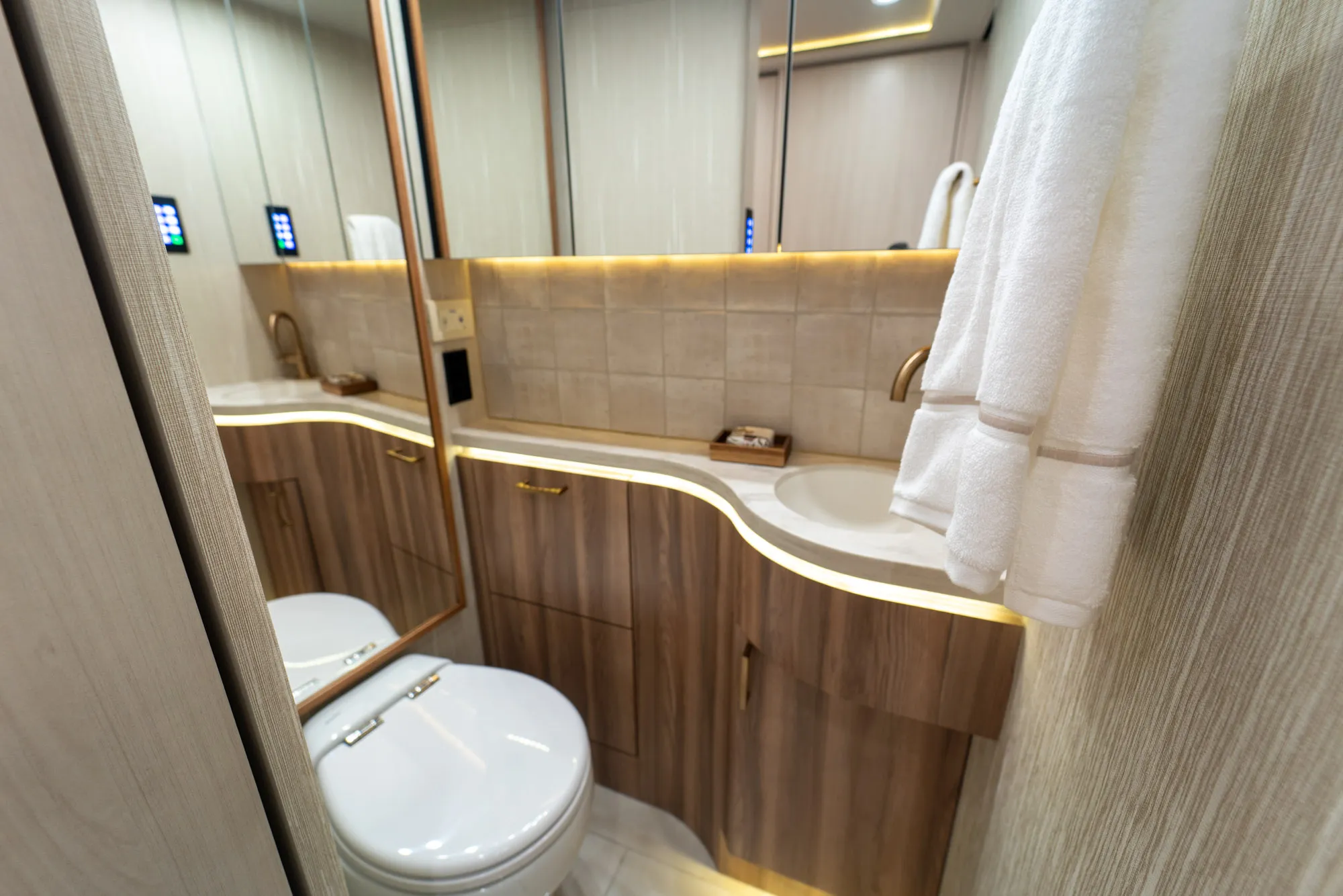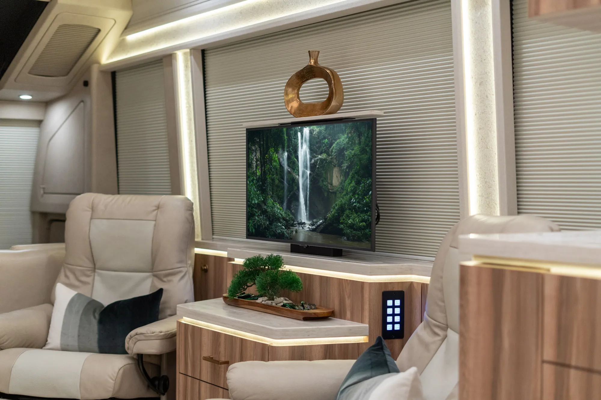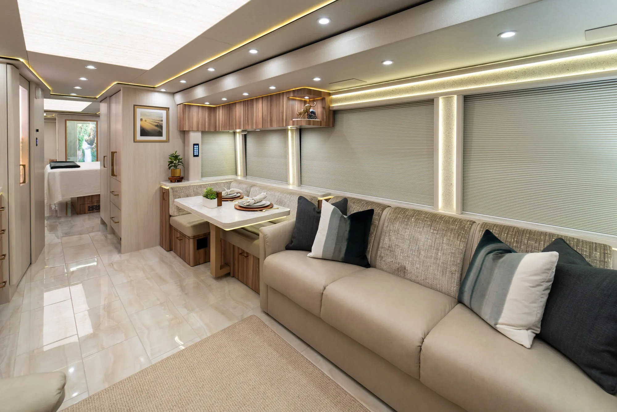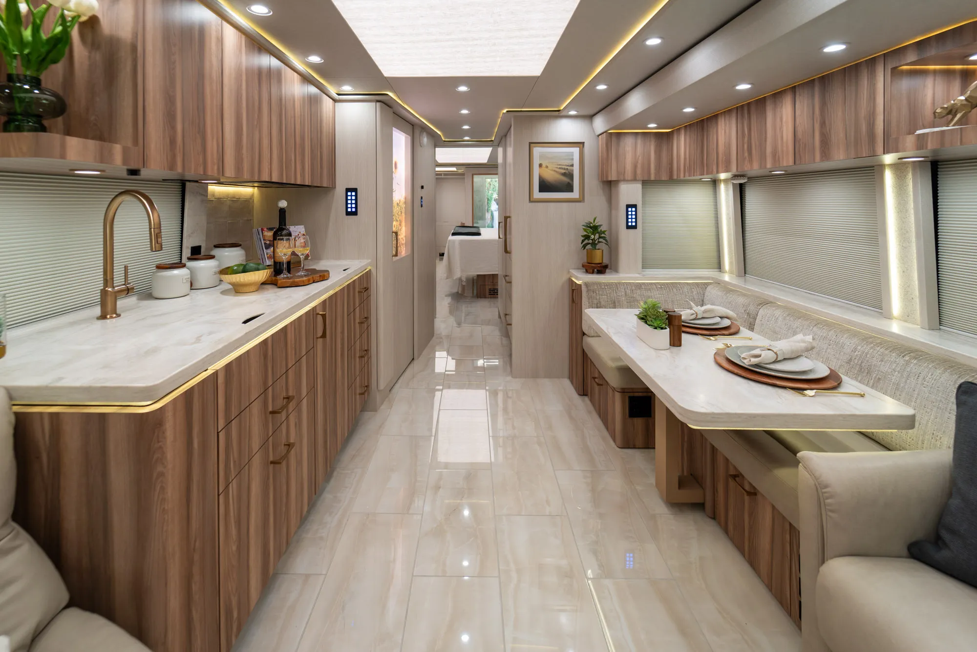 FEATURES SNAPSHOT\n● Crestron Audio with Surround Sound\n● Girard Automatic Awning Package with Fairings\n● 20 KW Kohler Generator with Auto-Gen\n● Patented Freedom Plus Sewer System\n● Patented TechLink Electrical System